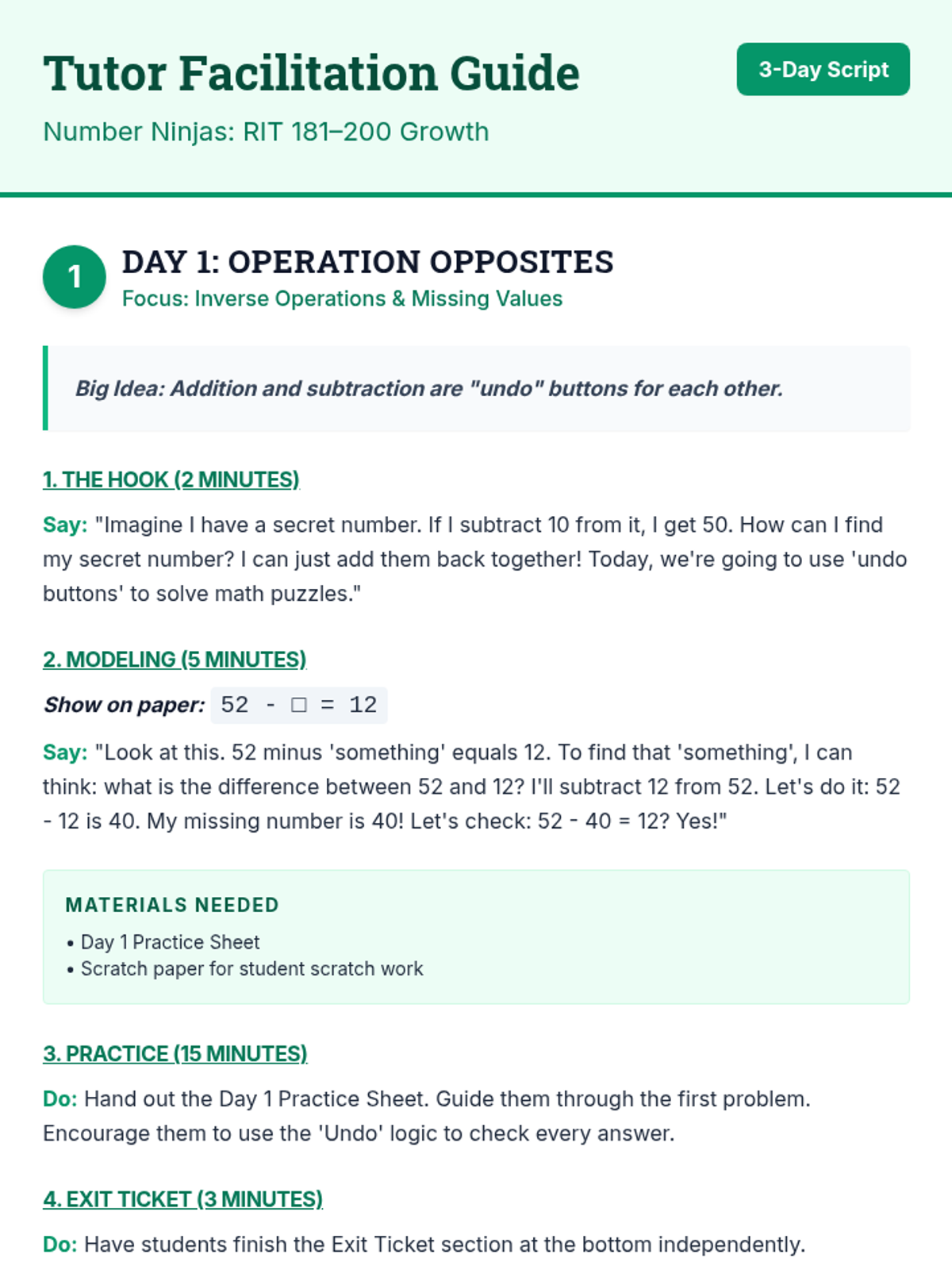 A comprehensive 3-day tutor script for small group sessions, focusing on inverse operations, like-denominator fractions, and multi-step word problems. Provides explicit modeling language, hook ideas, and check-your-work prompts for each daily session. Each day starts on a fresh page. Includes a problem bank for quick tutor reference.