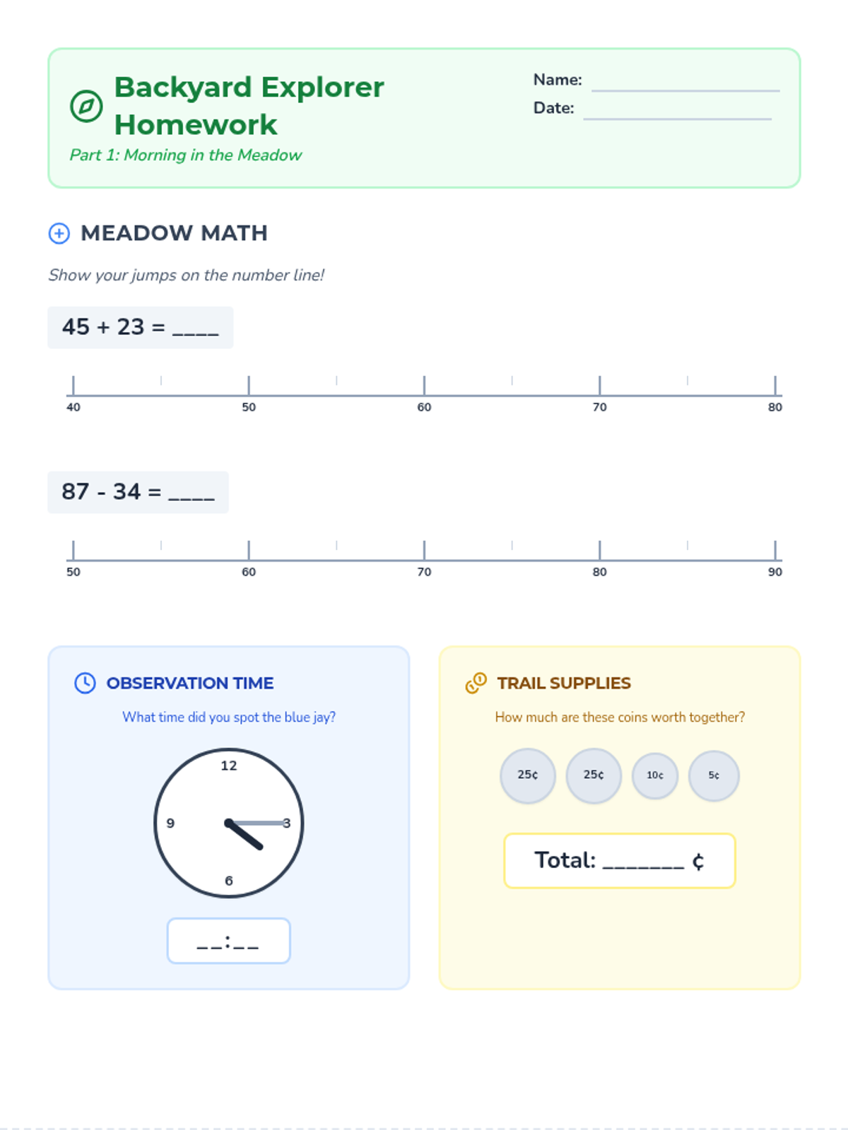 A 3-page mixed review homework packet for 3rd grade math featuring a backyard explorer theme. Covers addition/subtraction within 100, telling time, counting coins, multiplication intro, fractions intro, and visual word problems. Revised for better page breaks and accurate visual scaffolding.