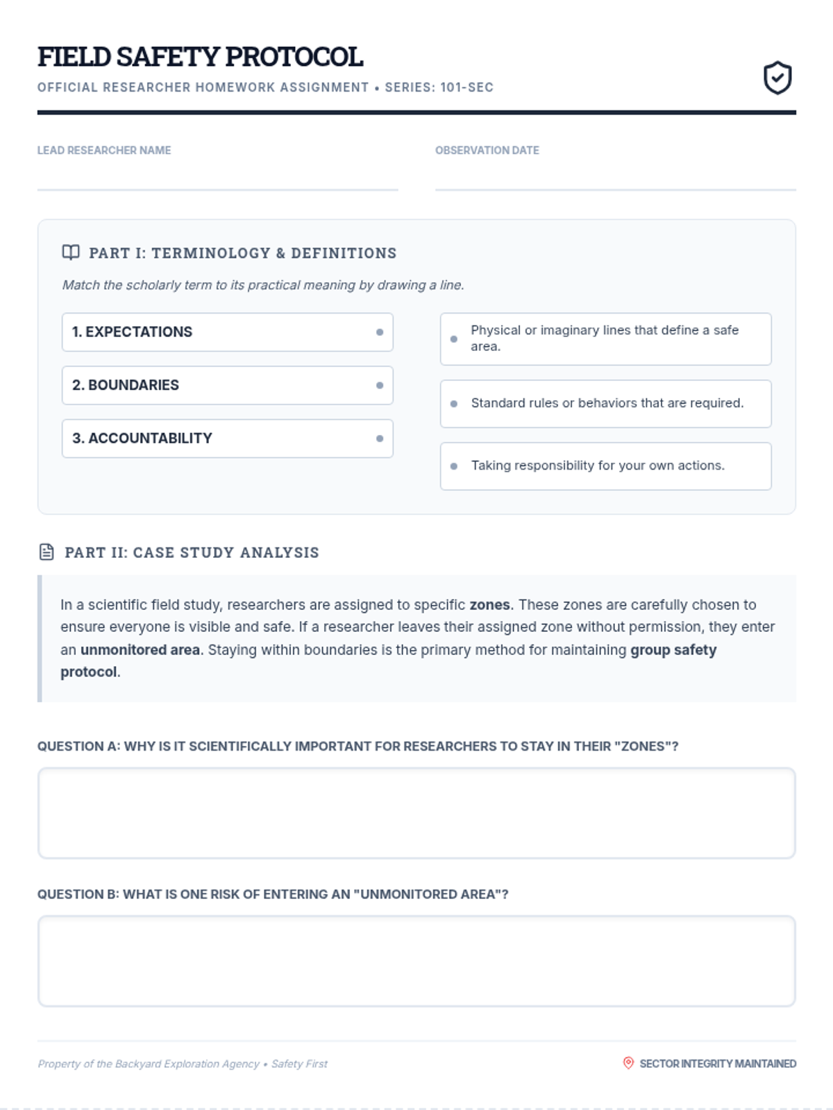 A scholarly-themed student homework assignment focused on meeting classroom expectations and the importance of staying in assigned areas for safety. Uses a "Field Safety Protocol" theme with scientific terminology to engage 3rd-grade students in behavioral logistics. Revised to fix page break issues and improve spacing for handwriting.