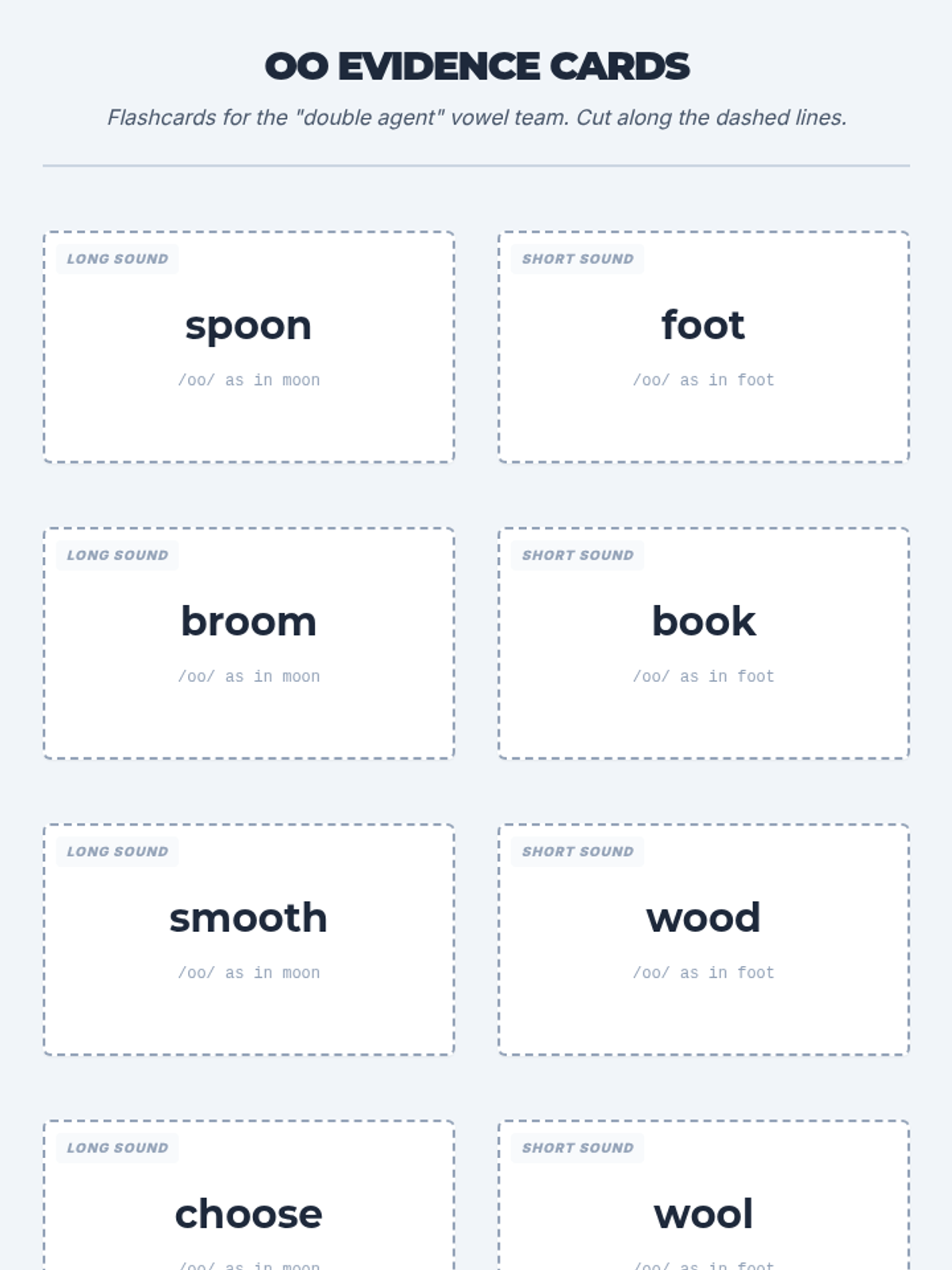 A set of printable flashcards for 4th-grade spelling words featuring the 'oo' vowel team. Includes sound labels to distinguish between long and short sounds.