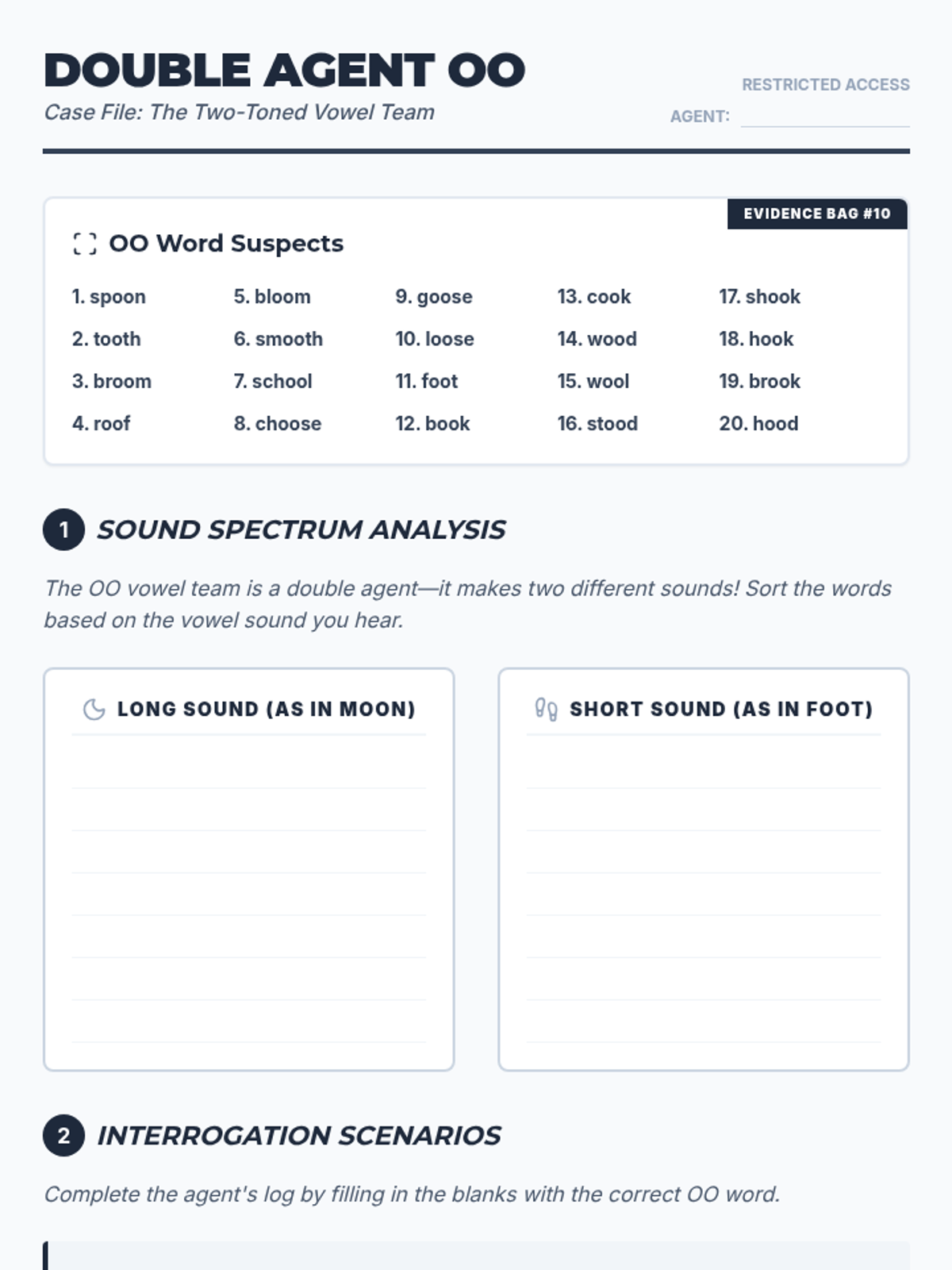 A detective-themed spelling worksheet for 4th grade focusing on the 'oo' vowel team. Includes sound sorting and contextual application activities.