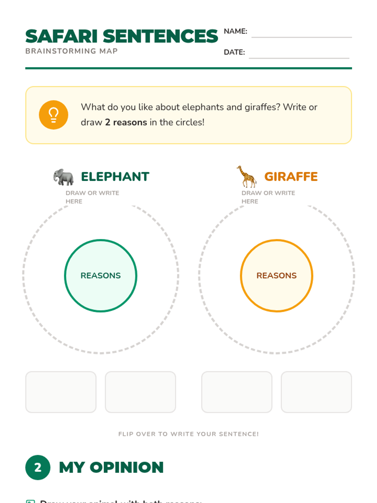 A two-page student worksheet featuring circle maps for brainstorming elephant and giraffe traits, followed by a writing and drawing area for a two-reason opinion sentence using the word 'and'.