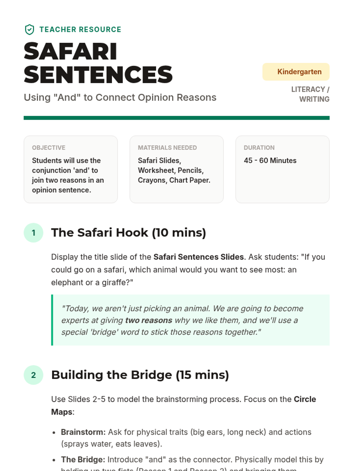 A comprehensive teacher lesson plan for kindergarten on using the word 'and' to provide two reasons for an opinion, featuring a hook, direct instruction steps, and differentiation tips.