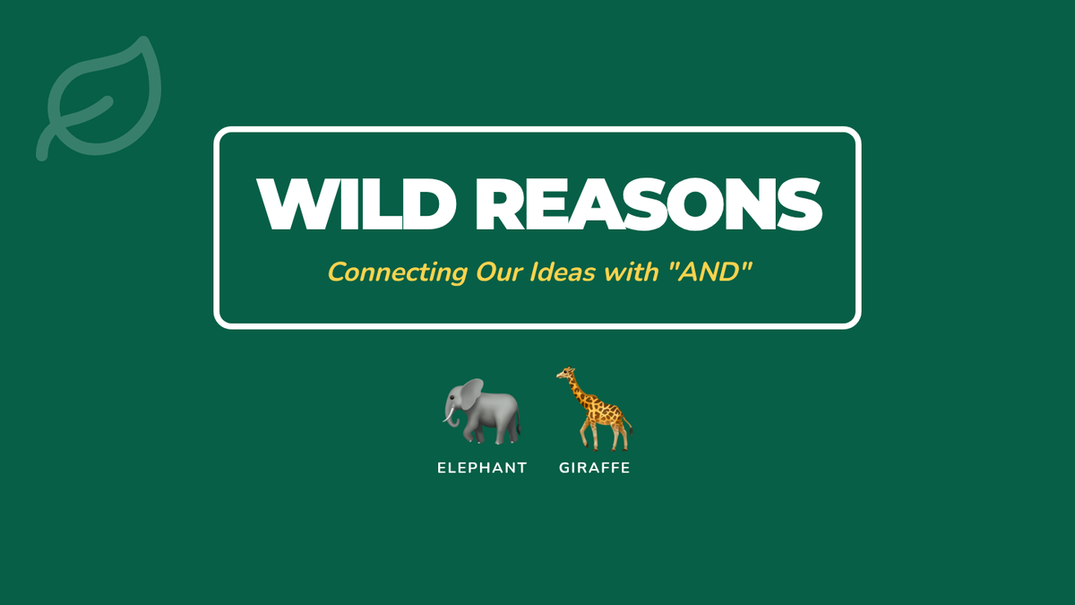 A vibrant safari-themed slide deck for kindergarten students, teaching them how to use the conjunction 'and' to connect two reasons in an opinion sentence. Includes circle maps with illustrative emojis for brainstorming.