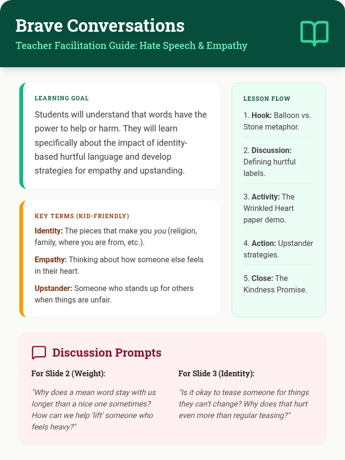 A teacher facilitation guide for the Kind Hearts Kind Words lesson, featuring kid-friendly definitions, discussion prompts, and instructions for 'The Wrinkled Heart' activity.
