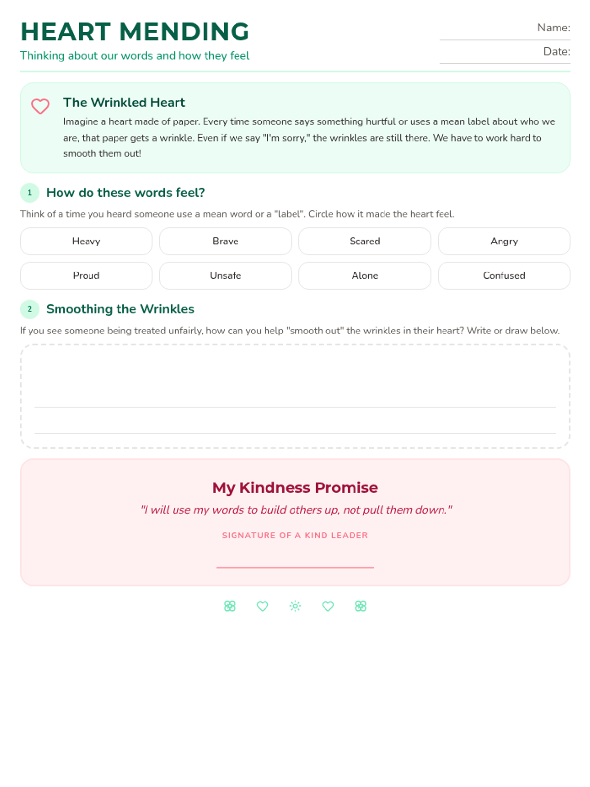 A reflection worksheet for 3rd graders that uses the 'wrinkled heart' metaphor to explore the impact of hurtful language and encourages them to brainstorm ways to be an upstander.