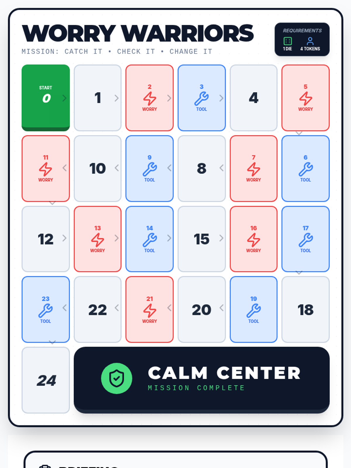A printable board game kit for students, including a game board through "Thought City" and scenario/tool cards that help students practice CBT techniques.