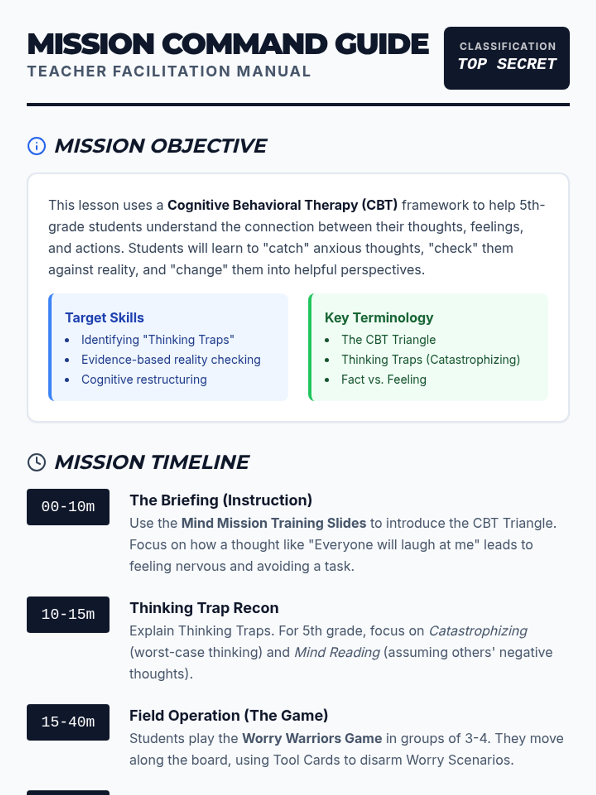 A teacher's facilitation guide for the Worry Warriors lesson, including mission objectives, a detailed pacing guide, and tips for facilitating CBT concepts with 5th-grade students.