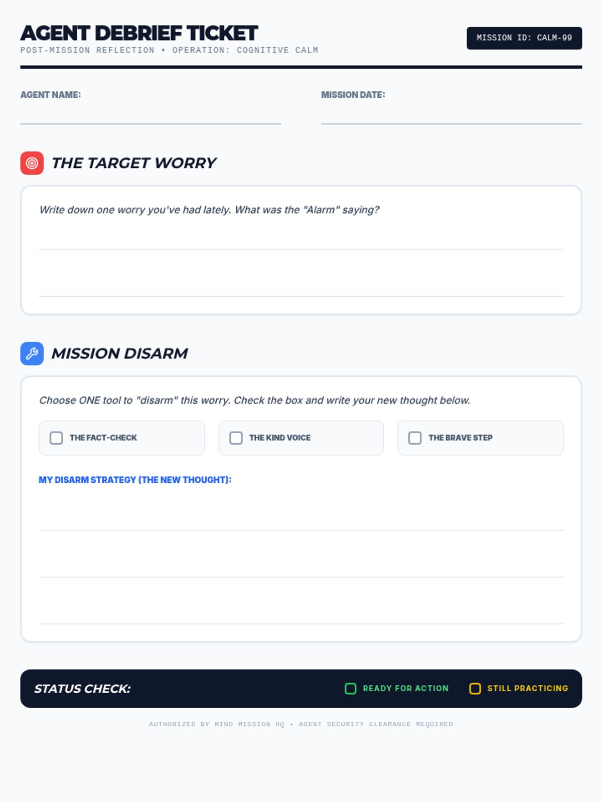 An exit ticket for students to reflect on a personal worry and apply one of the CBT tools (Fact-Check, Kind Voice, or Brave Step) they learned during the mission.