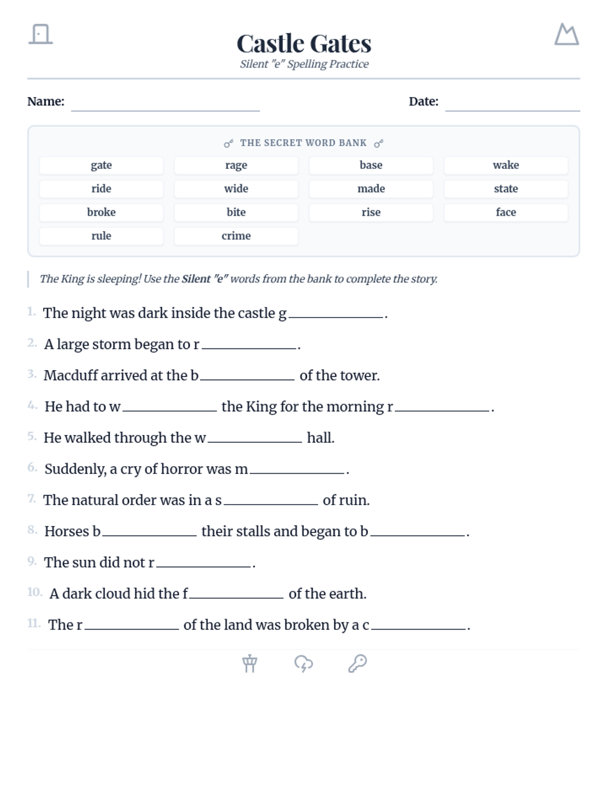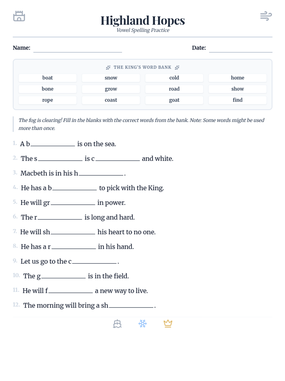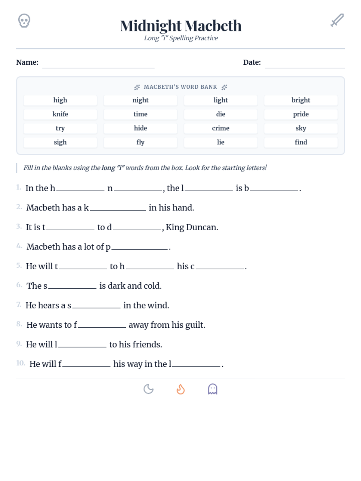 A fill-in-the-blank worksheet where students practice spelling long 'i' words from sentences inspired by Macbeth. Added starting letters for clarity and tightened layout to fit one page. Updated with wider blanks for handwriting.