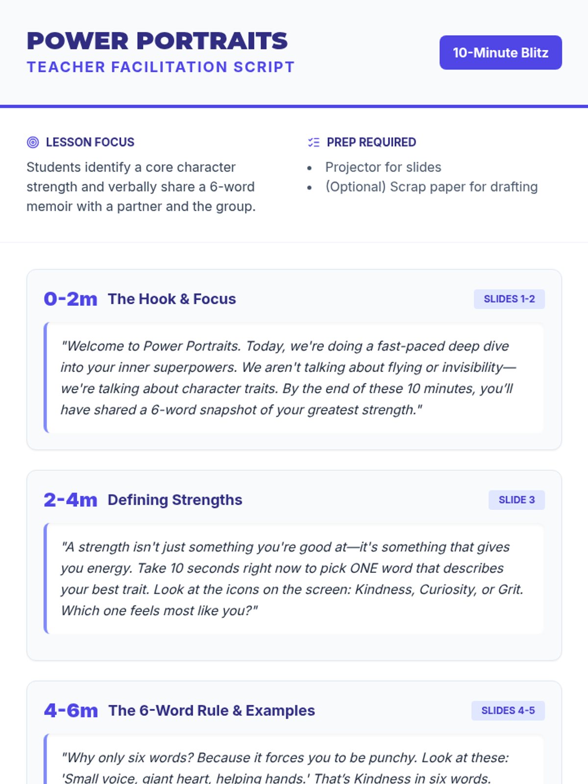 A structured, minute-by-minute guide for teachers to deliver the Power Portraits lesson, including talking points, prompts, and a verbal sharing sequence.