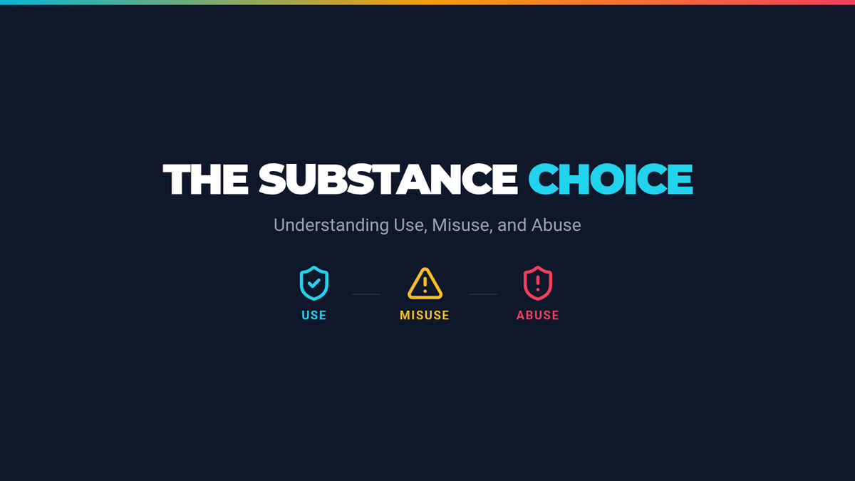 A high-impact slide presentation covering the differences between substance use, misuse, and abuse, with specific focuses on vaping, tobacco, alcohol, marijuana, and prescription drugs. Revised to fix contrast and icon rendering issues.