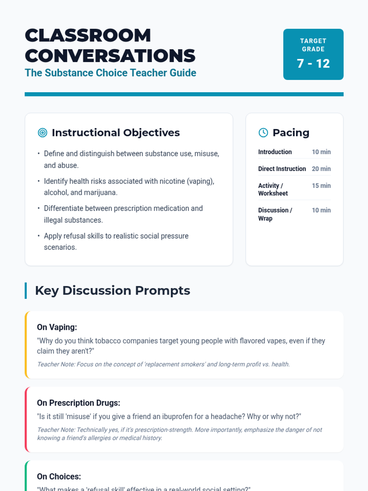 A comprehensive teacher's guide for the Substance Choice lesson. Revised to fix page breaks, pacing section alignment, and orphaned text issues. Fit onto two pages for better utility.