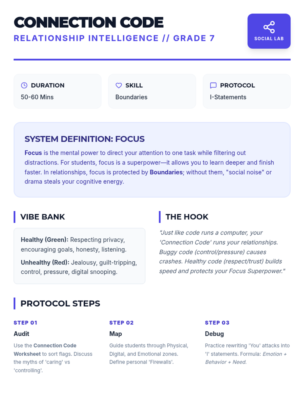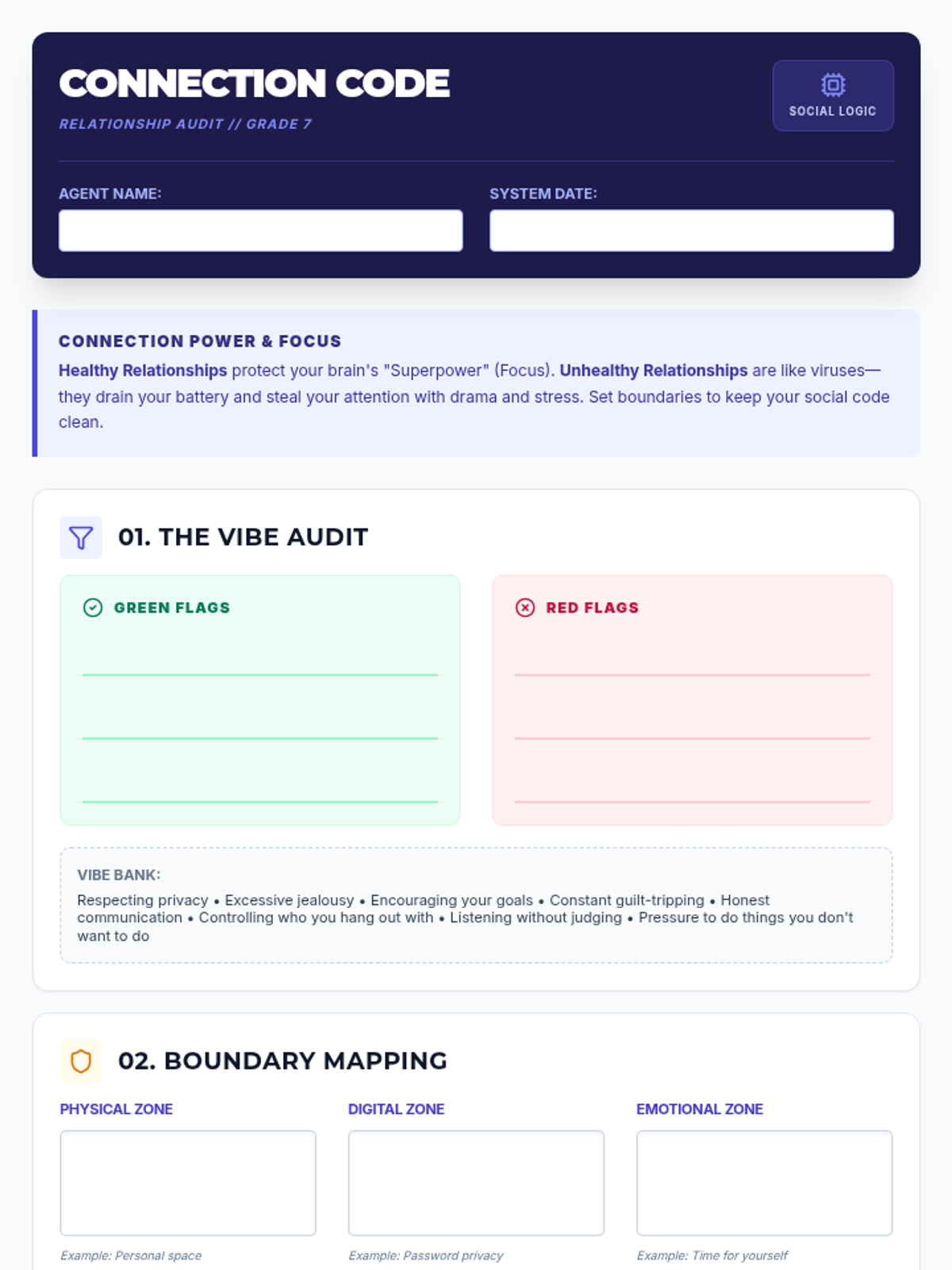 A student worksheet for the 'Connection Code' lesson, featuring a relationship vibe audit, boundary mapping exercises, and an I-statement communication debugger for 7th grade students.