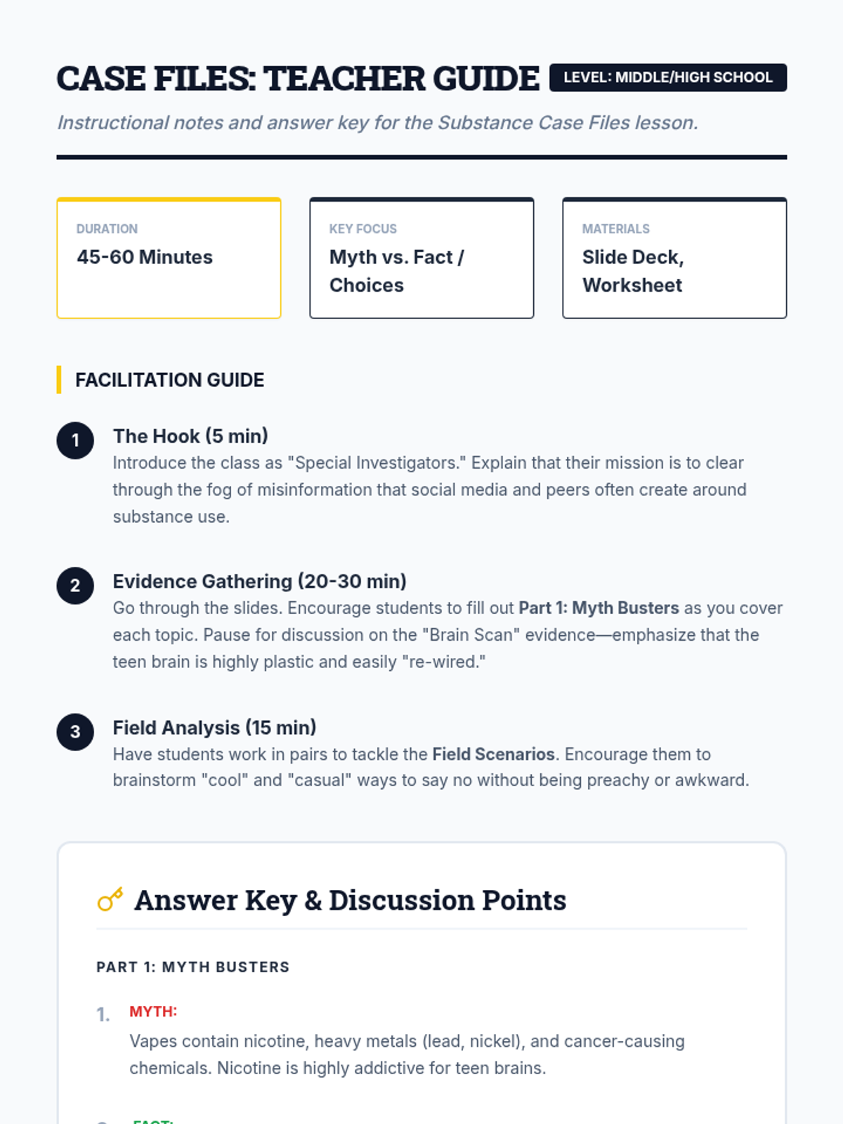 A teacher's facilitation guide and answer key for the Substance Case Files lesson. Includes pacing suggestions, discussion hooks, and model answers for student worksheets.