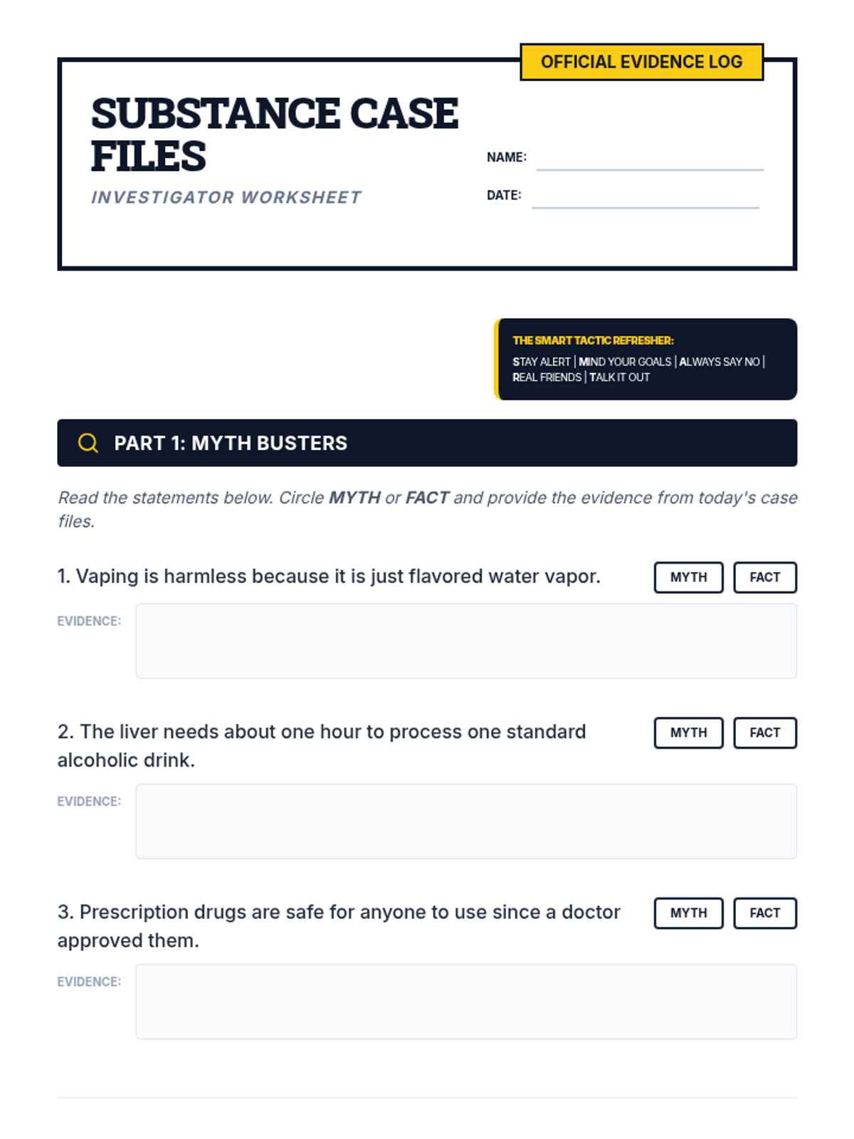 An investigative student worksheet designed for students to document evidence, debunk myths, and analyze real-world scenarios regarding substance use. Includes space for handwriting and critical thinking.