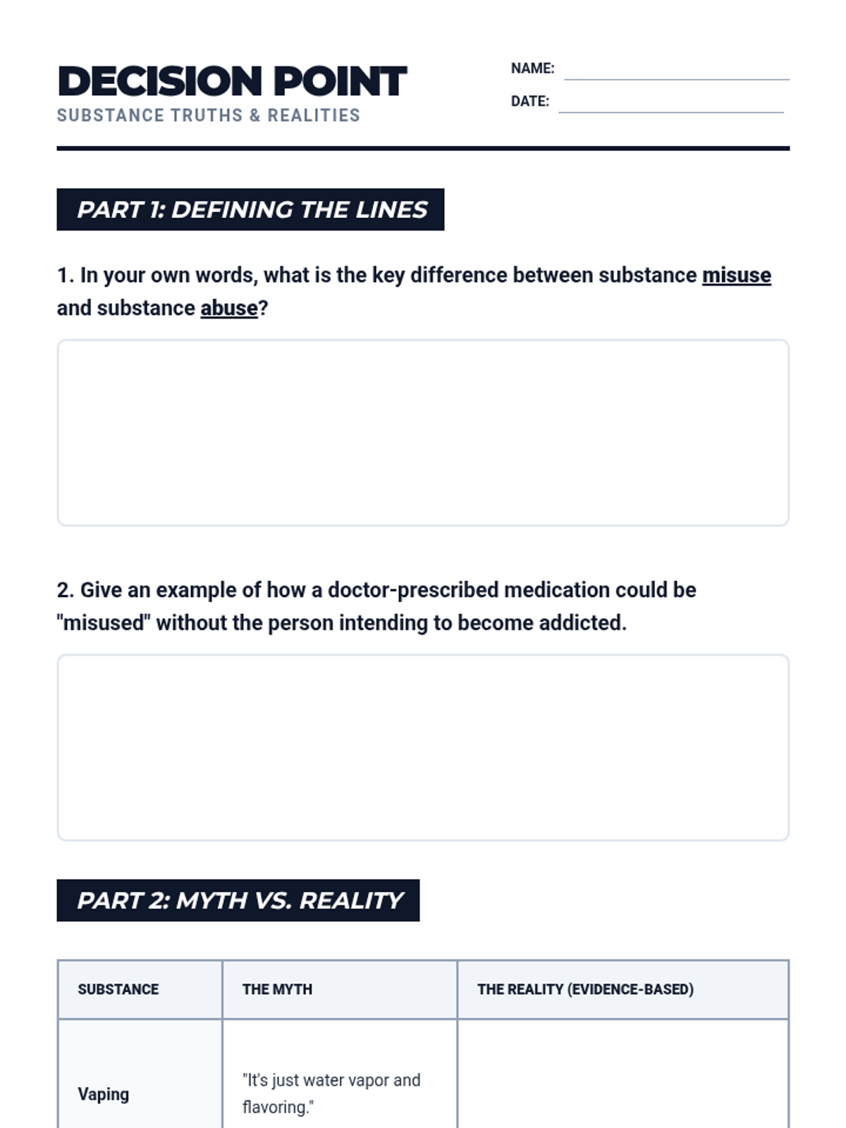 A student-facing worksheet designed to reinforce concepts of substance use, misuse, and abuse. Revised to fix severe page breaking issues and improve contrast for printing. Final polish to fit perfectly on two pages.