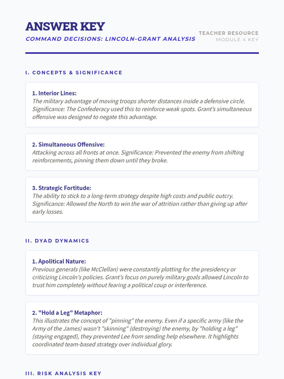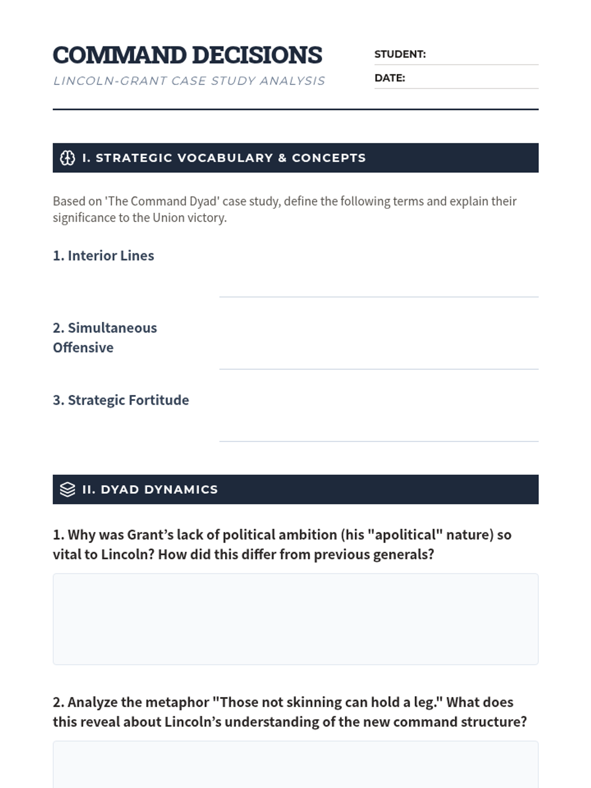 A targeted student worksheet analyzing the strategic partnership between Lincoln and Grant, featuring vocabulary, critical thinking questions, and a risk-analysis exercise.