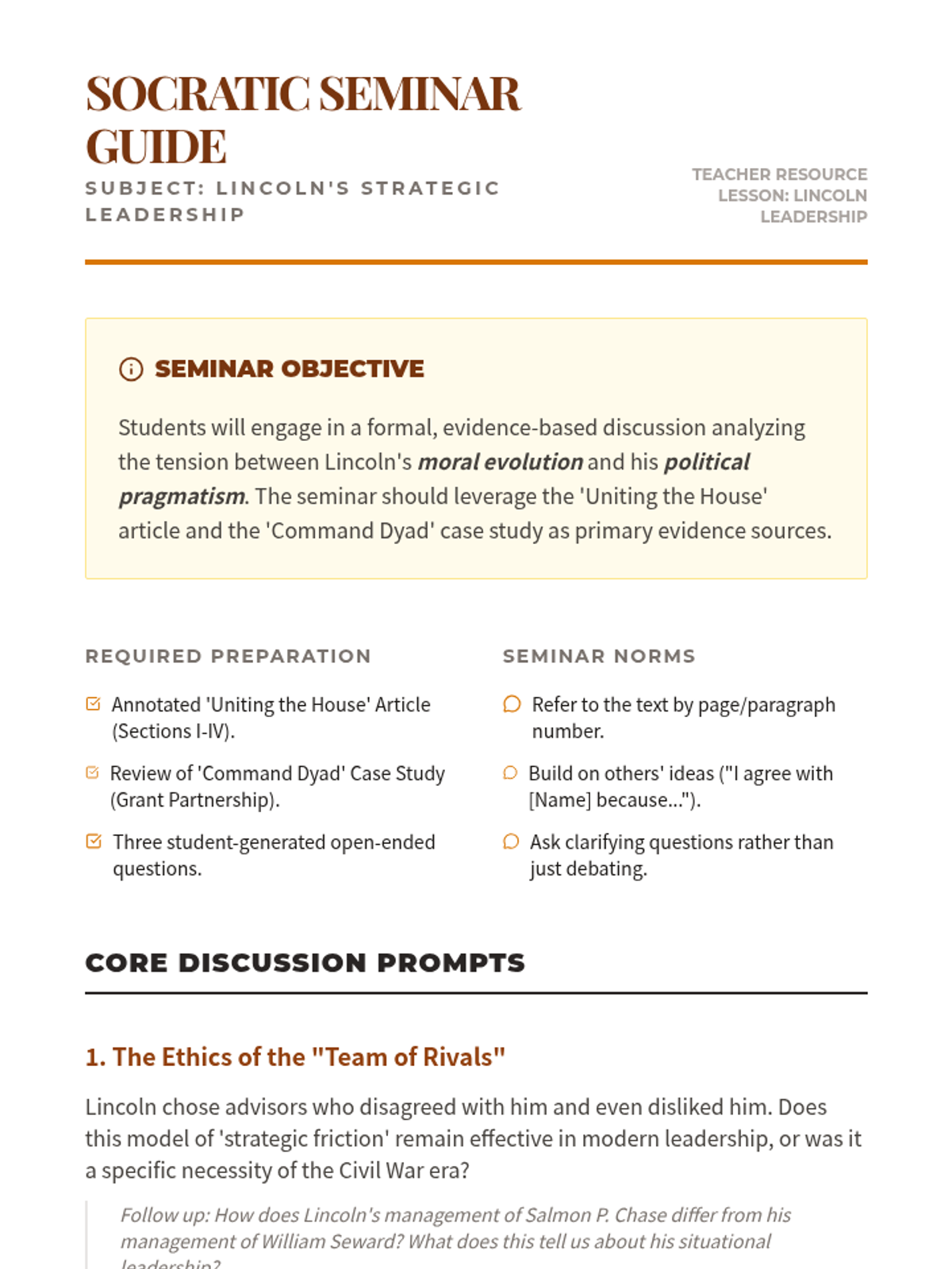 A Socratic Seminar facilitation guide for teachers, featuring core discussion prompts, seminar norms, and observation criteria focused on Lincoln's leadership and the Grant partnership.