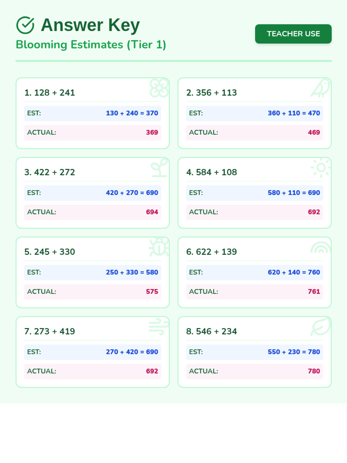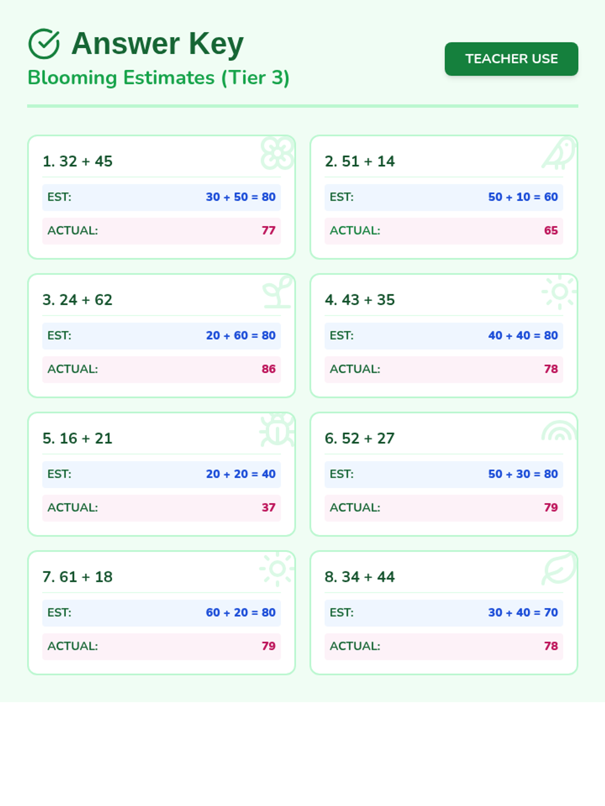 Polished answer key for the Tier 3 Blooming Estimates worksheet with reinforced spring theme and improved contrast.