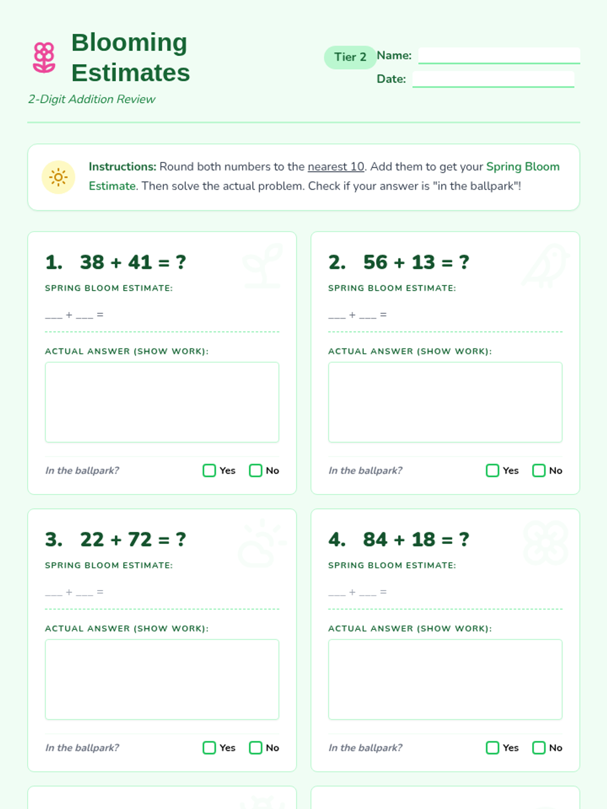 A spring-themed math worksheet for Tier 2 students focusing on 2-digit addition and ballpark estimates by rounding to the nearest ten. Improved layout and page breaking.