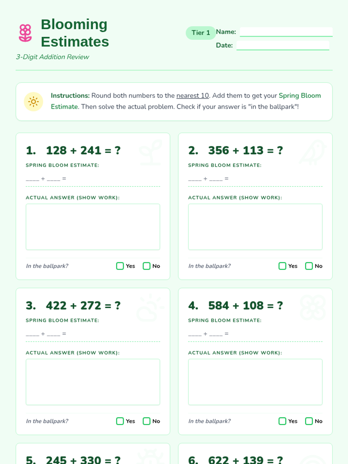 A spring-themed math worksheet for Tier 1 students focusing on 3-digit addition and ballpark estimates by rounding to the nearest ten. Improved layout and page breaking.