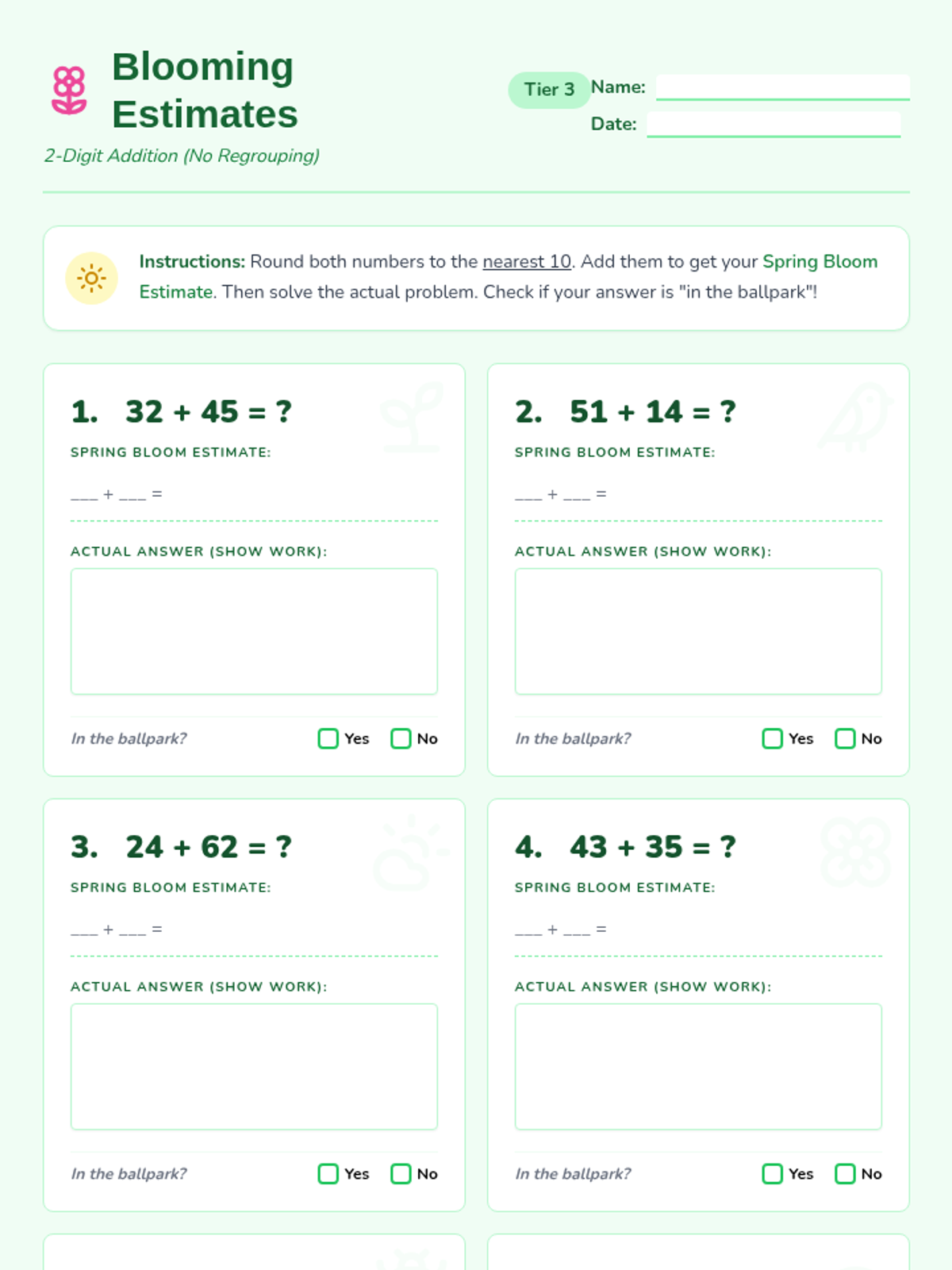 A spring-themed math worksheet for Tier 3 students focusing on 2-digit addition with no regrouping and ballpark estimates by rounding to the nearest ten. Improved layout and page breaking.