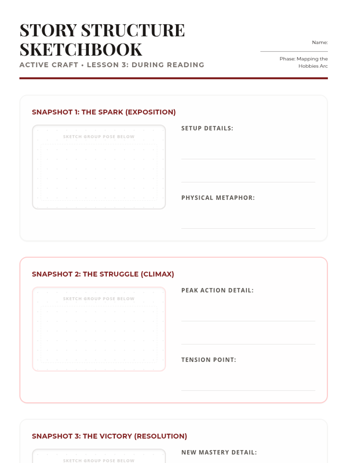 A planning worksheet for tableaux. Revised for 'Active Craft' branding and During Reading categorization for narrative structure. Hobbies theme.