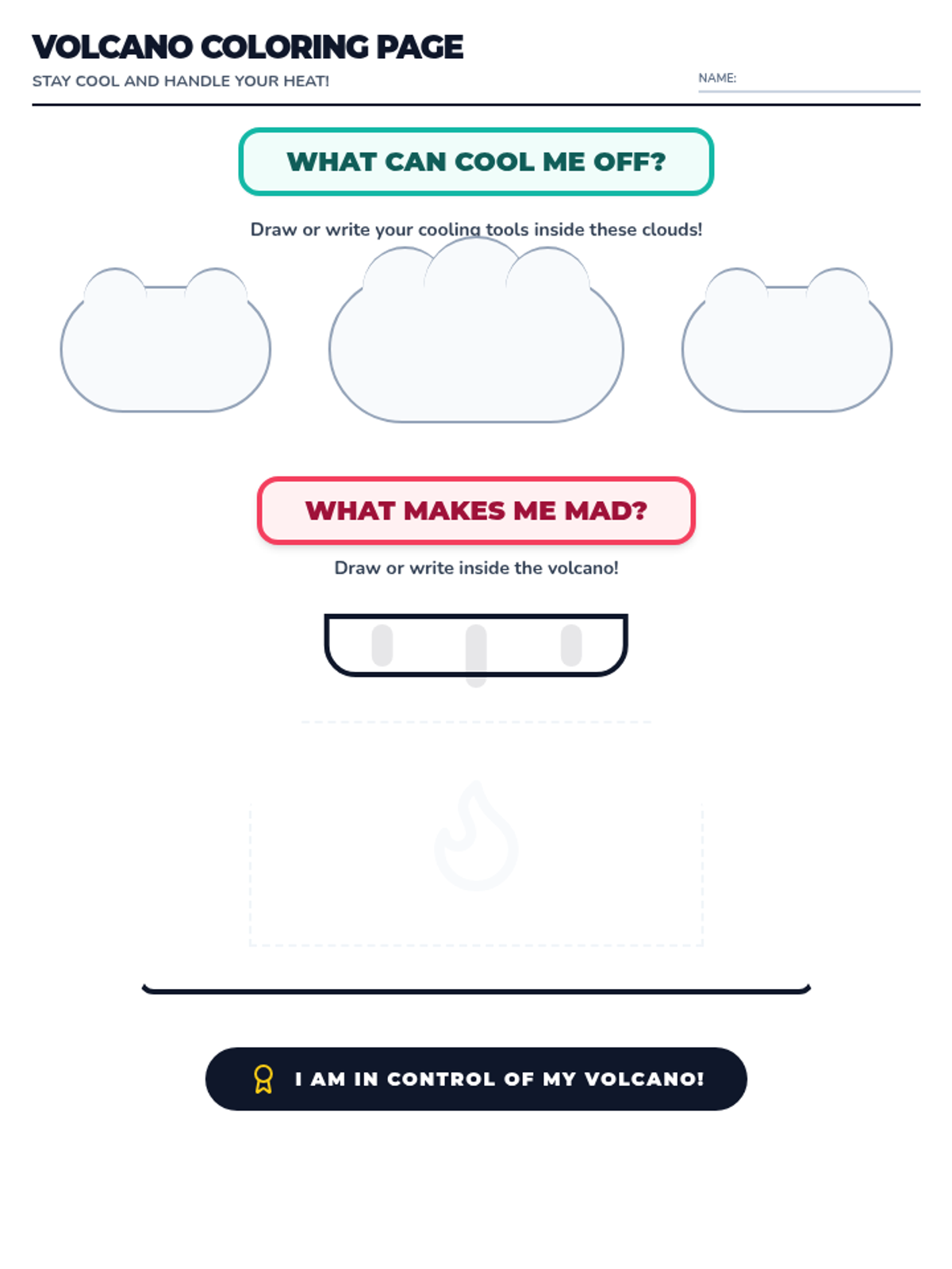 A creative coloring and reflection page for students to identify personal anger triggers and effective cooling strategies using a volcano visual. Revised for single-page layout and better visual structure.