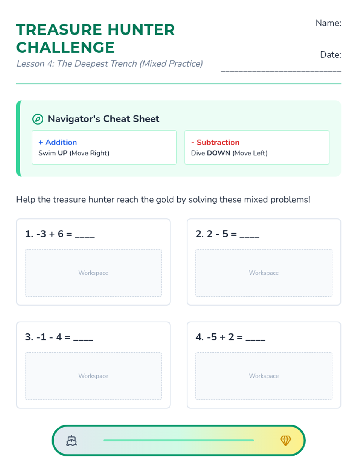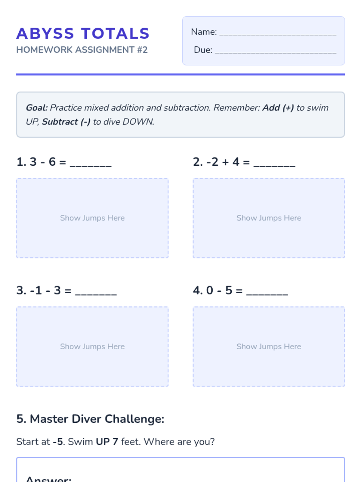 The second homework assignment for the Deep Sea Divers sequence. It offers mixed practice of adding and subtracting with negative numbers, featuring large workspaces and a 'Master Diver' challenge.