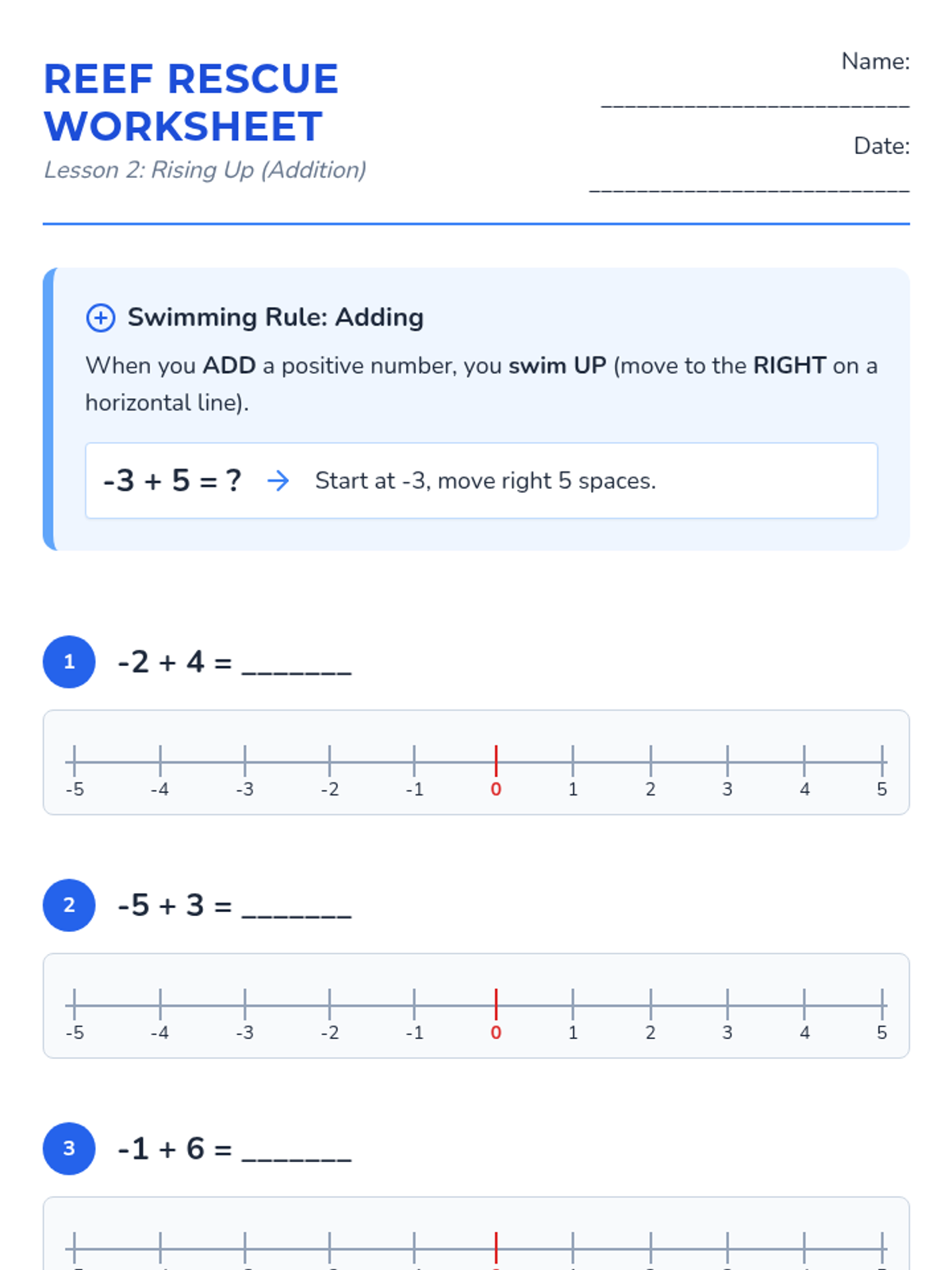 The first homework assignment for the Deep Sea Divers sequence. It focuses on adding positive integers to negative starting points using visual number lines. Designed for clarity and low cognitive load.