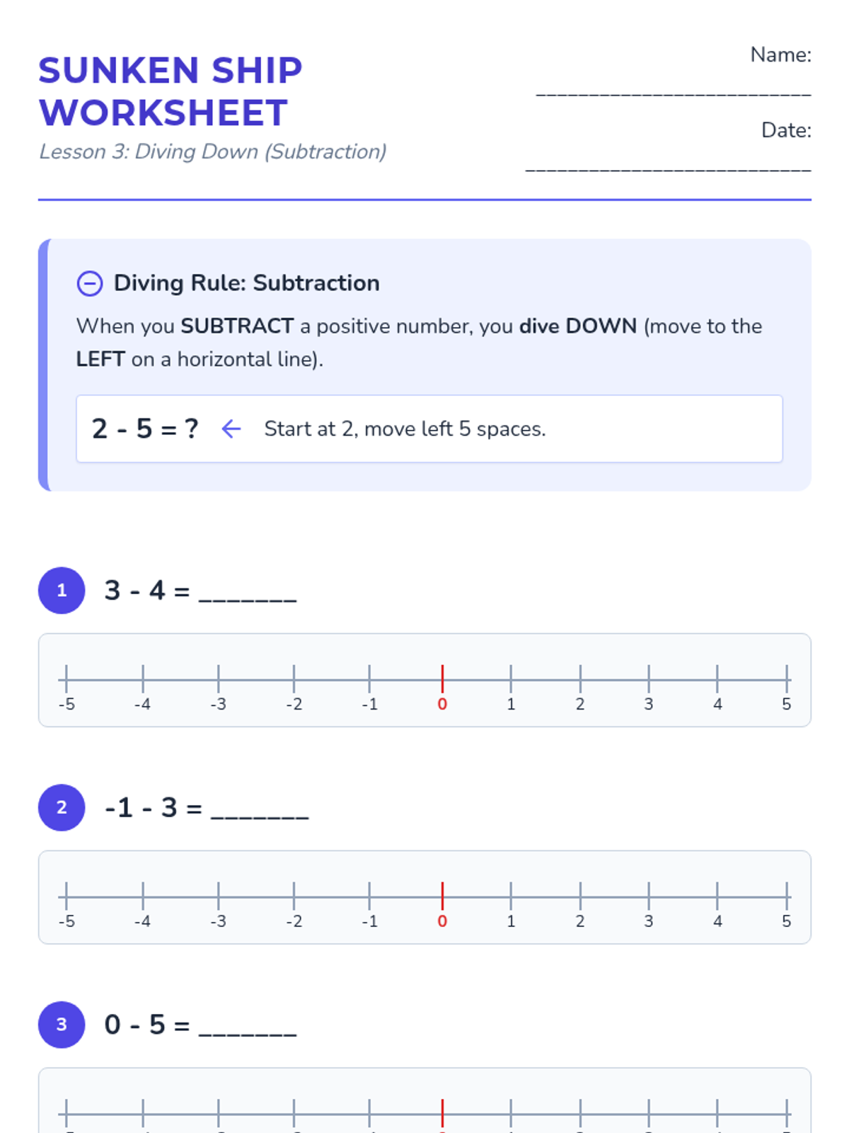 A worksheet for Lesson 3 focusing on subtraction. It uses a 'diving down' metaphor to help students visualize moving left on the number line. includes generous workspace and low numbers.