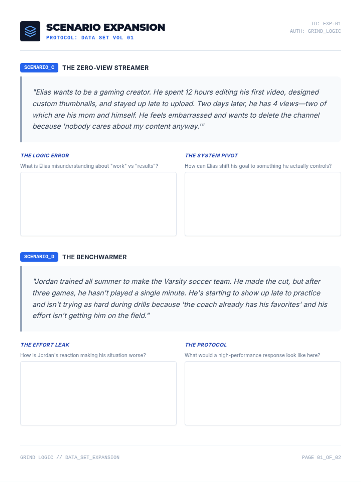 A comprehensive facilitator guide for the 'Grind Logic' program, providing instructional context, session breakdowns, implementation strategies, and discussion prompts for mentors working with teen boys on resilience and effort.