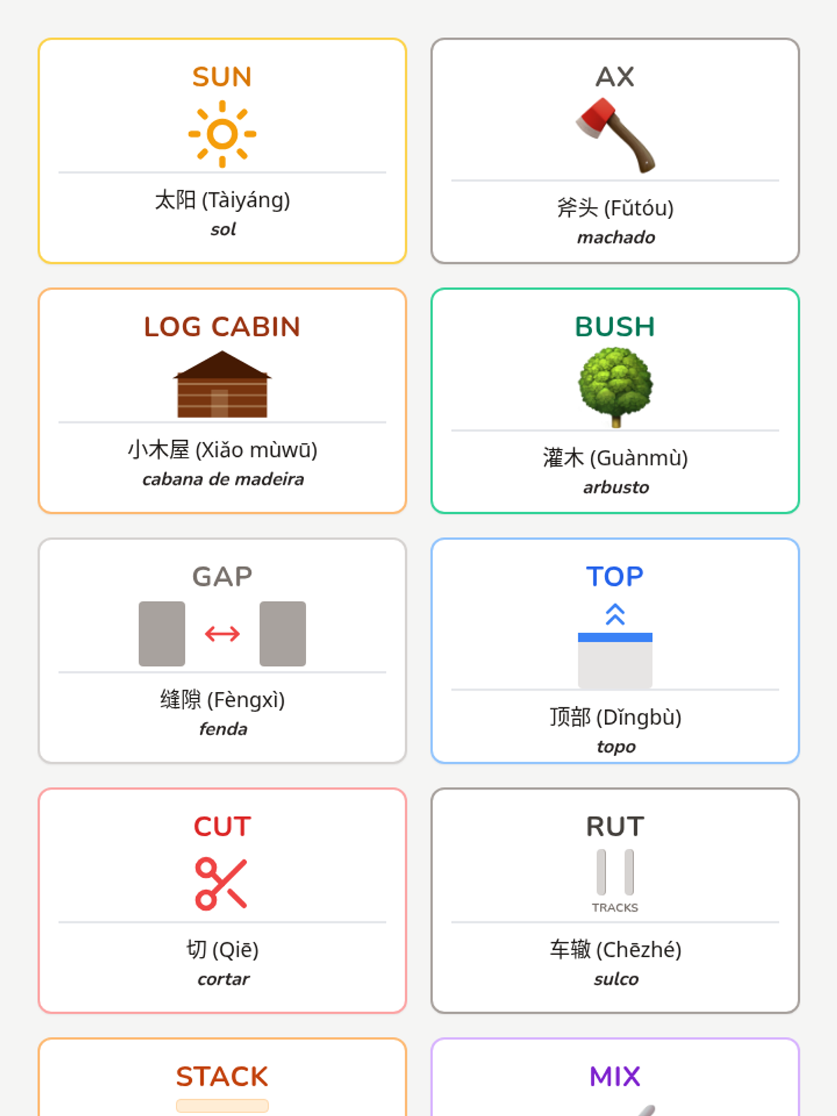 A set of bilingual vocabulary cards featuring English, Chinese, and Portuguese translations, accompanied by simple visual icons for early readers. Vocabulary includes words like sun, ax, and mud, with child-appropriate imagery.