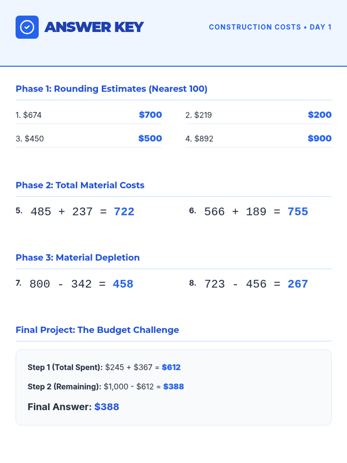 Answer key for the Day 1 Construction Costs Worksheet.