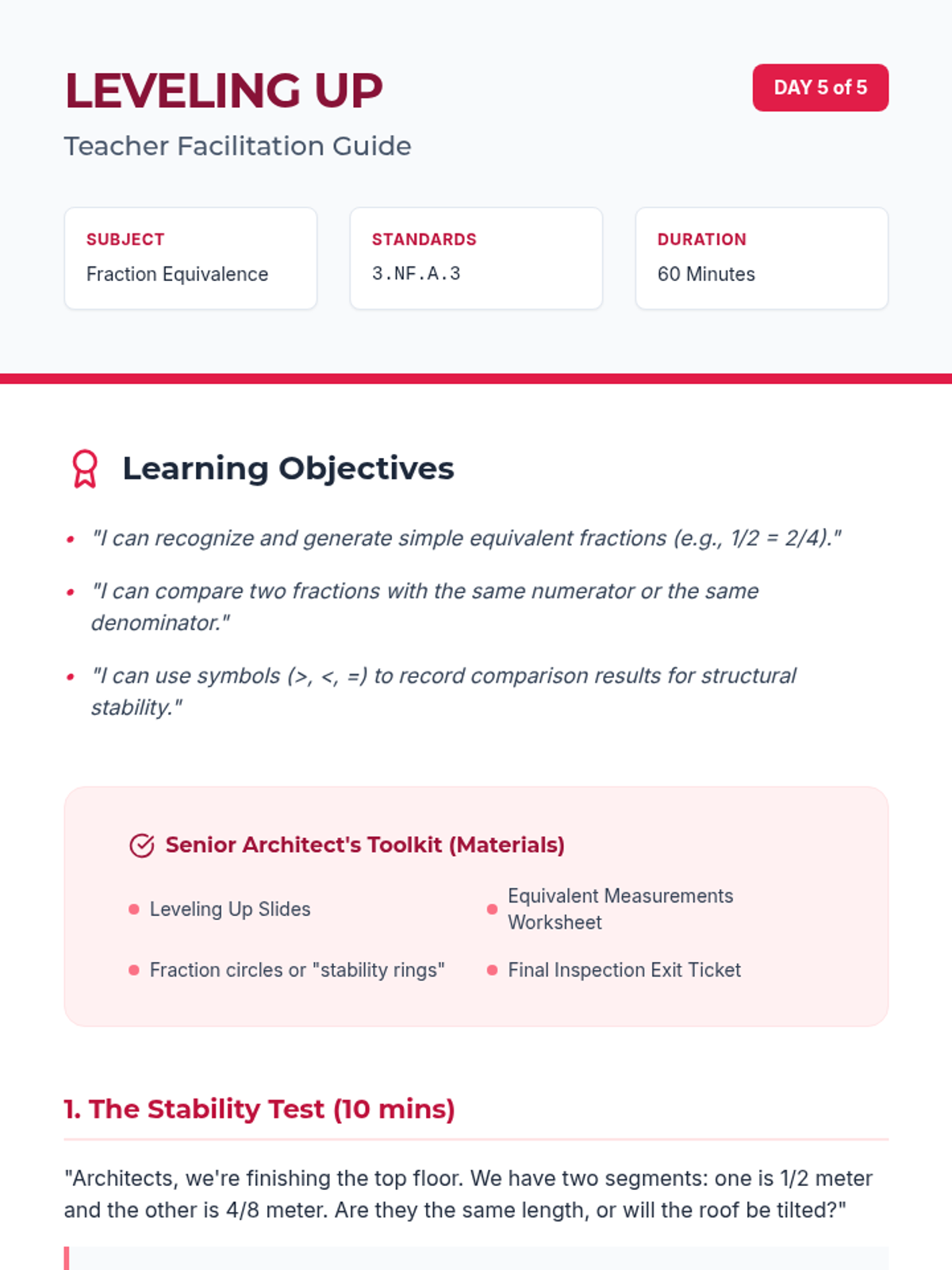A detailed teacher facilitation guide for Day 5, focusing on fraction equivalence and comparison within an architectural context.