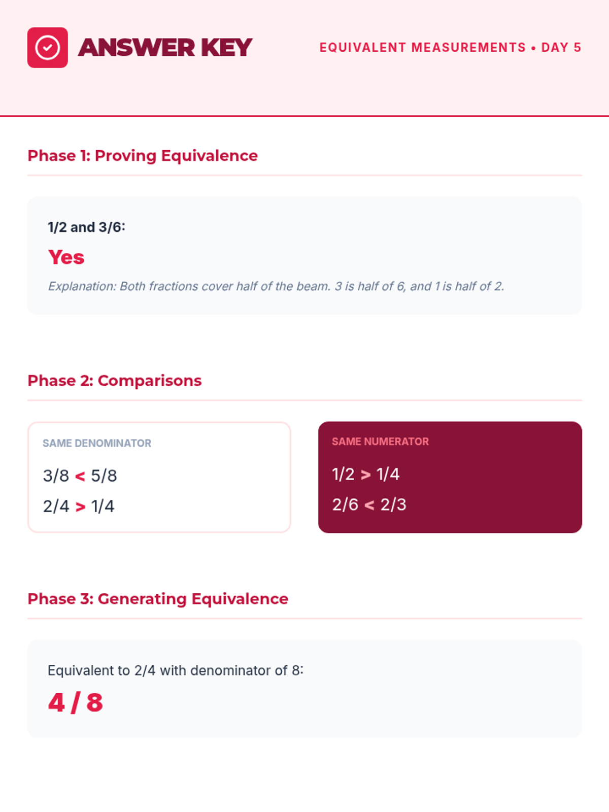 Answer key for the Day 5 Equivalent Measurements Worksheet.