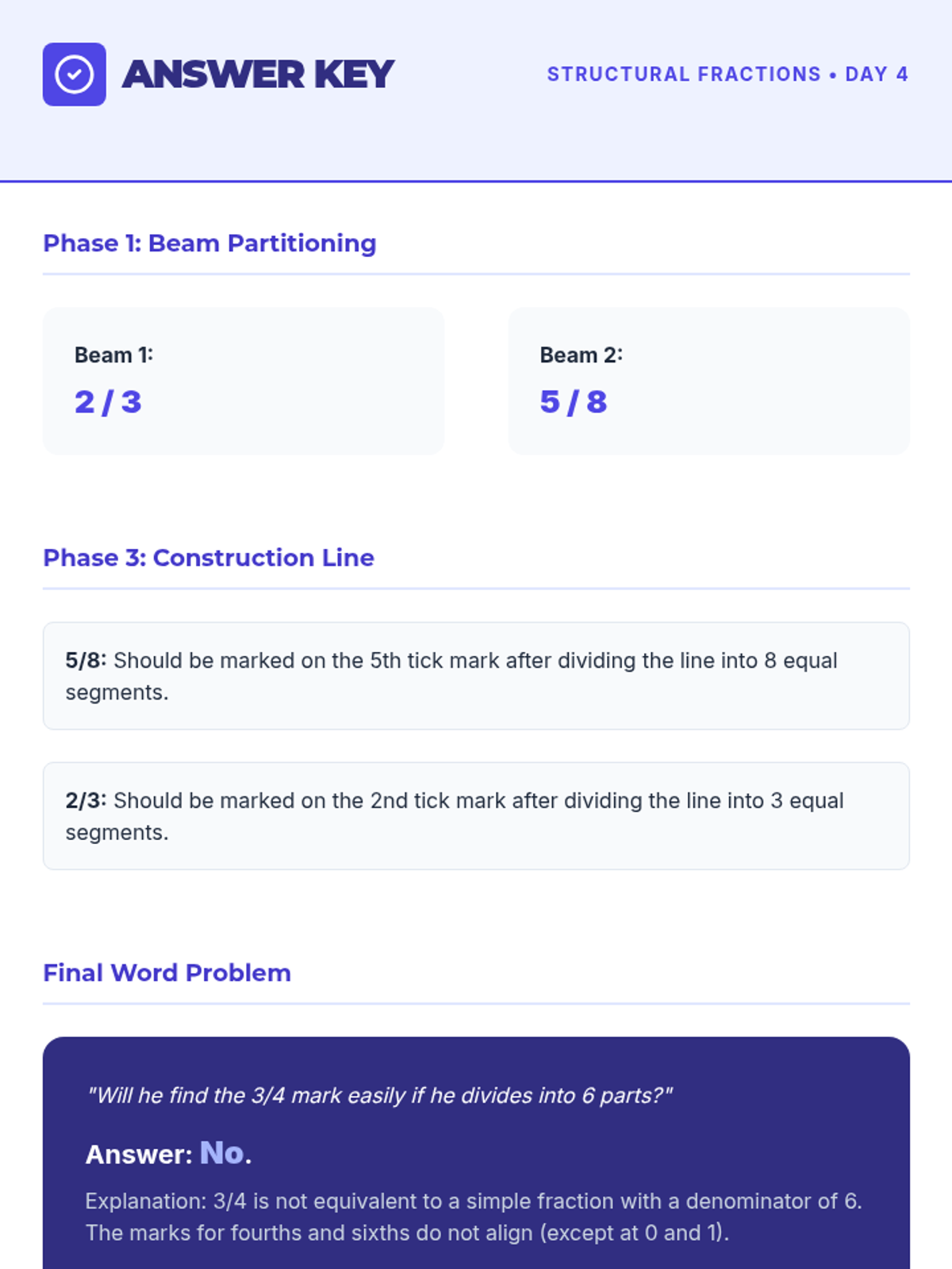Answer key for the Day 4 Blueprint Fractions Worksheet.