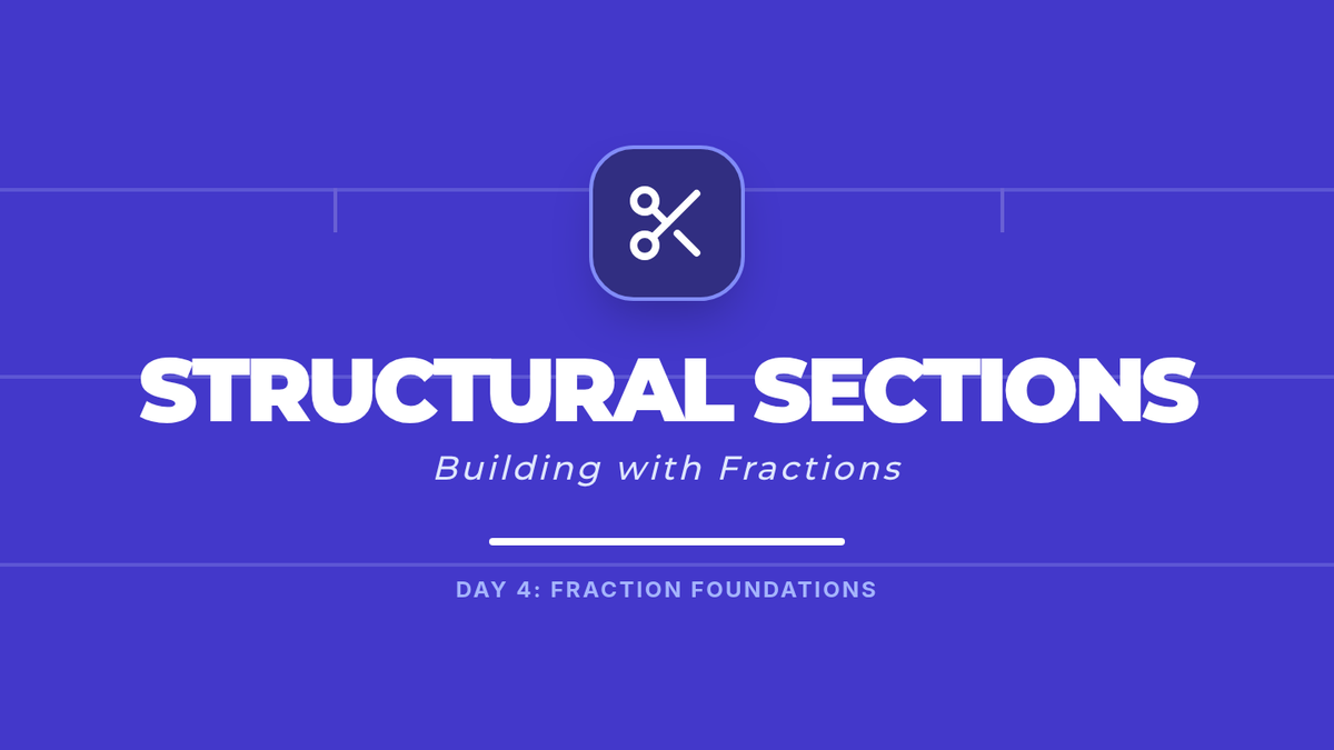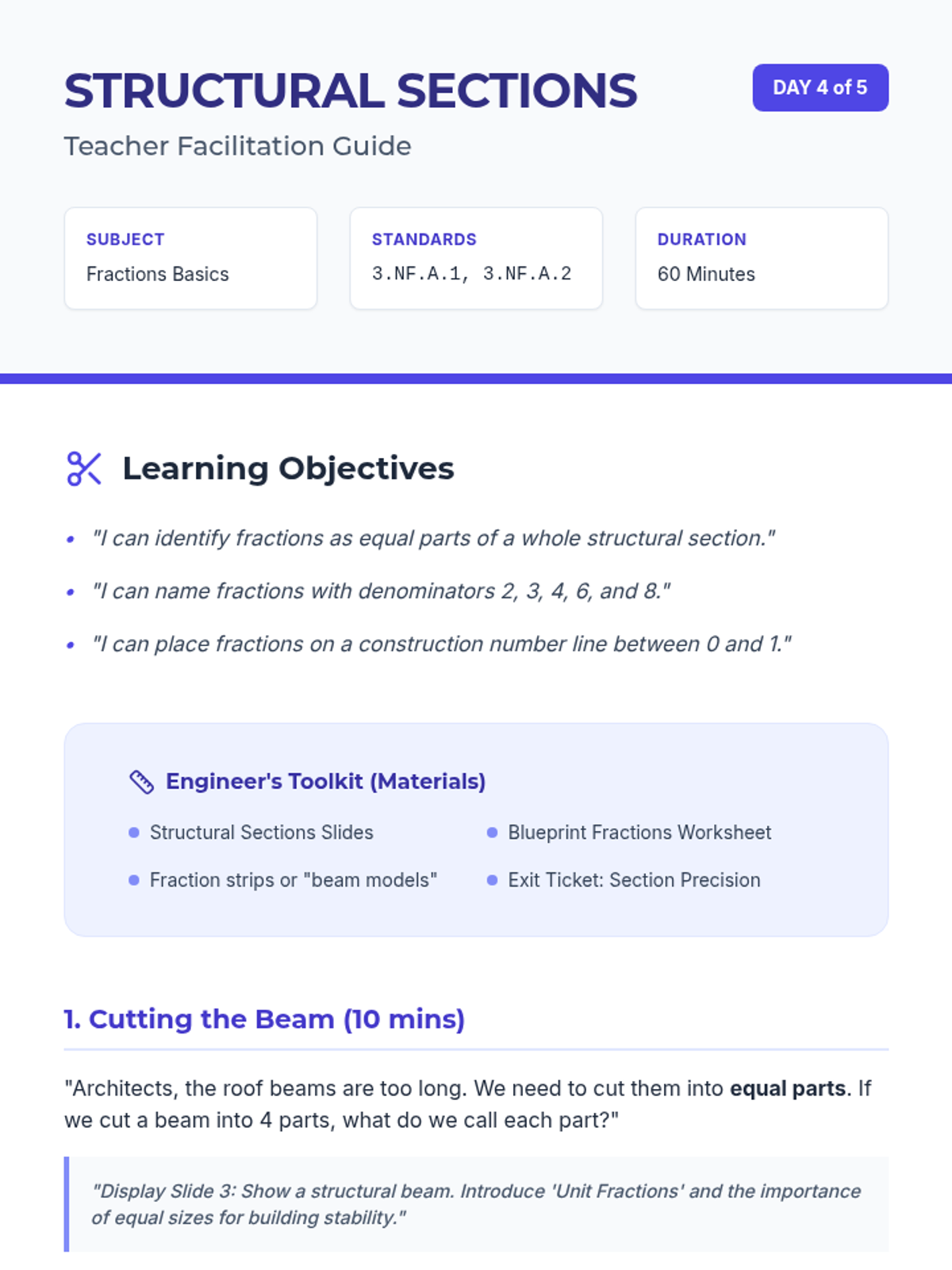 A detailed teacher facilitation guide for Day 4, introducing fractions as parts of structural sections and placing them on number lines.