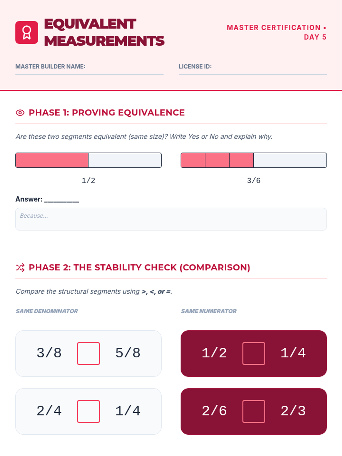 Equivalent measurements worksheet for Day 5 practice with fraction equivalence and comparing fractions with same numerator or denominator.