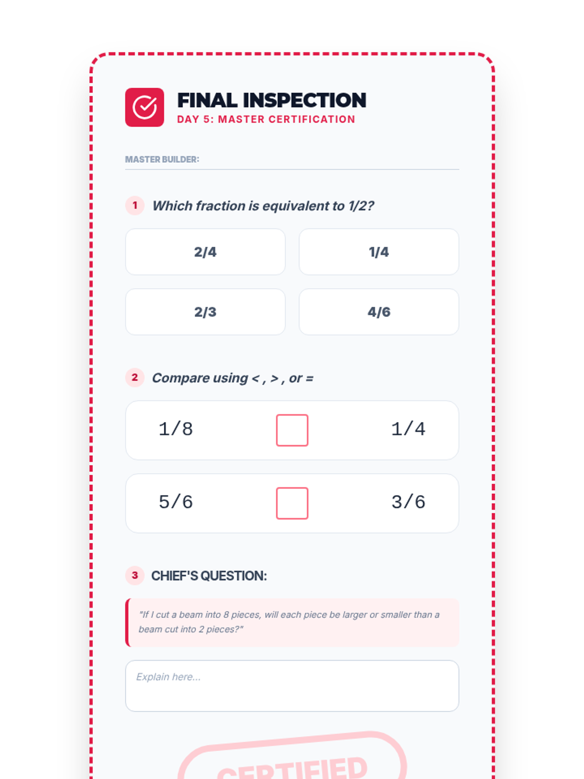 A short end-of-lesson assessment for Day 5 to check fraction identification and comparison within an architectural theme.