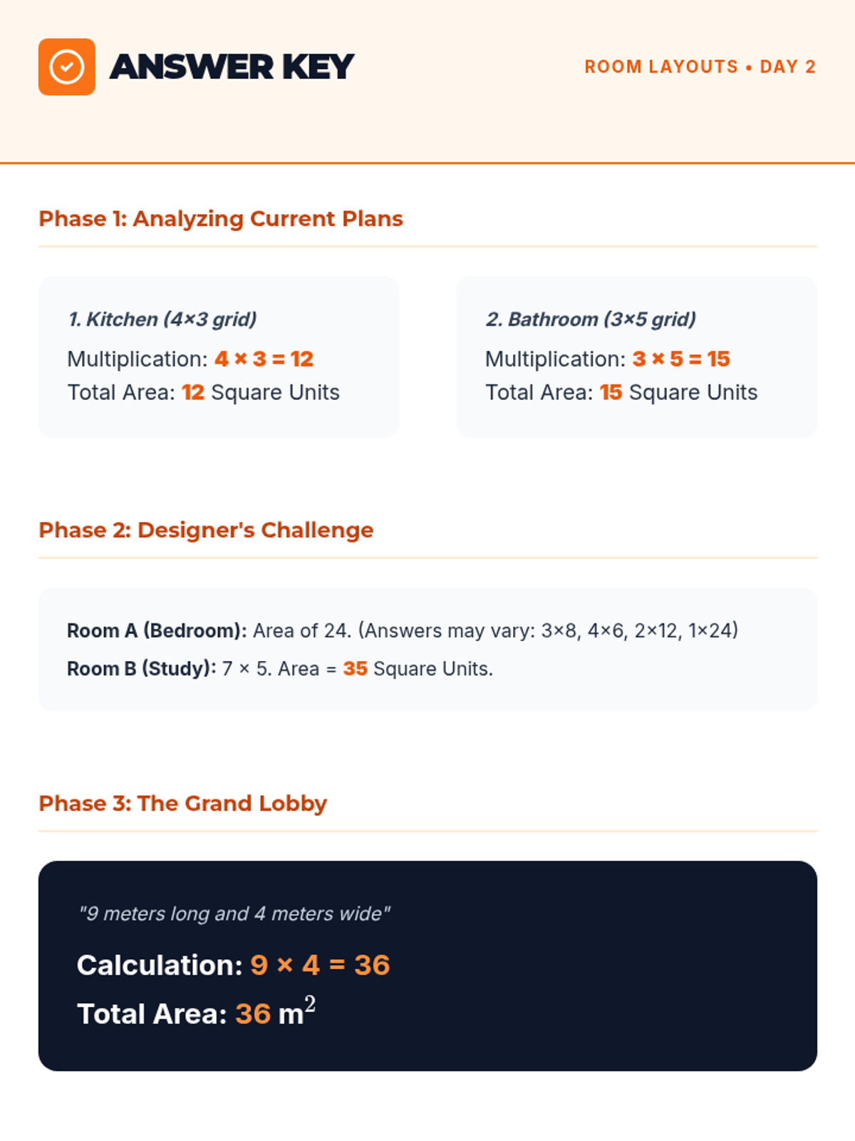 Answer key for the Day 2 Room Layout Worksheet.