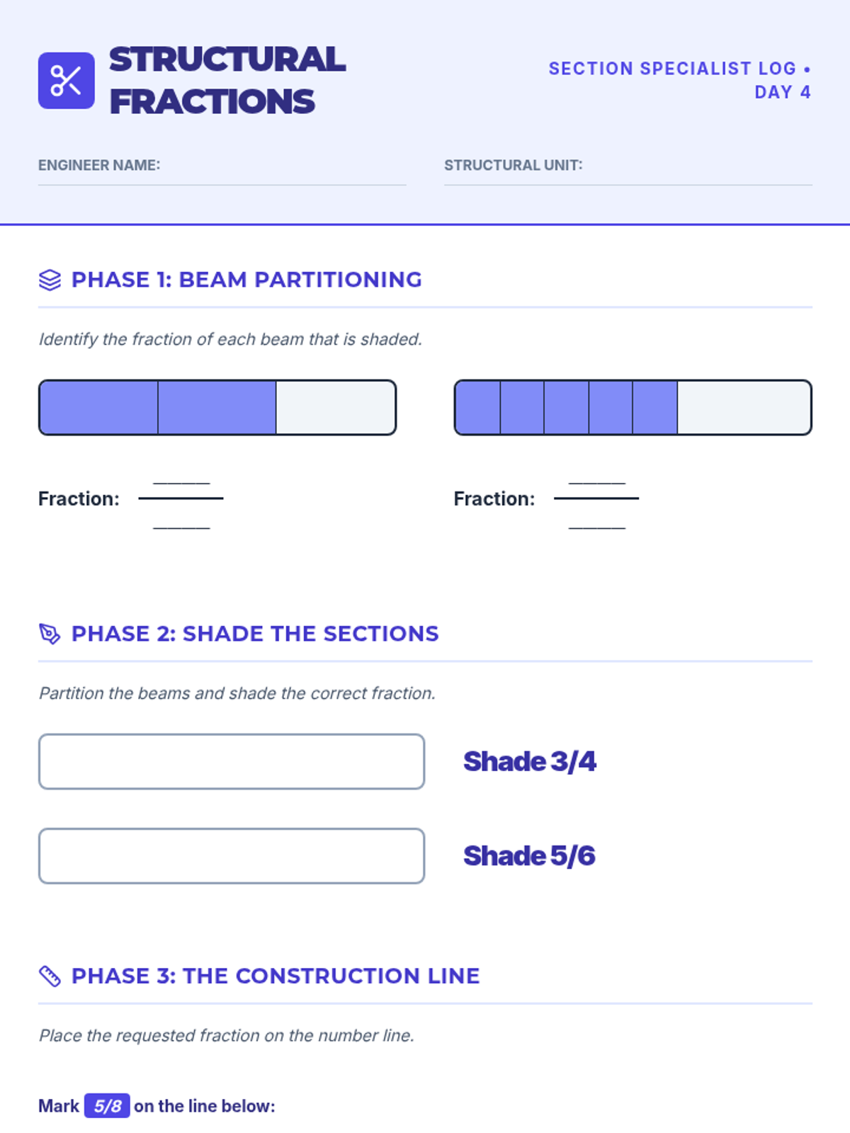 Blueprint fractions worksheet for Day 4 practice with identifying parts of a whole and placing fractions on number lines.