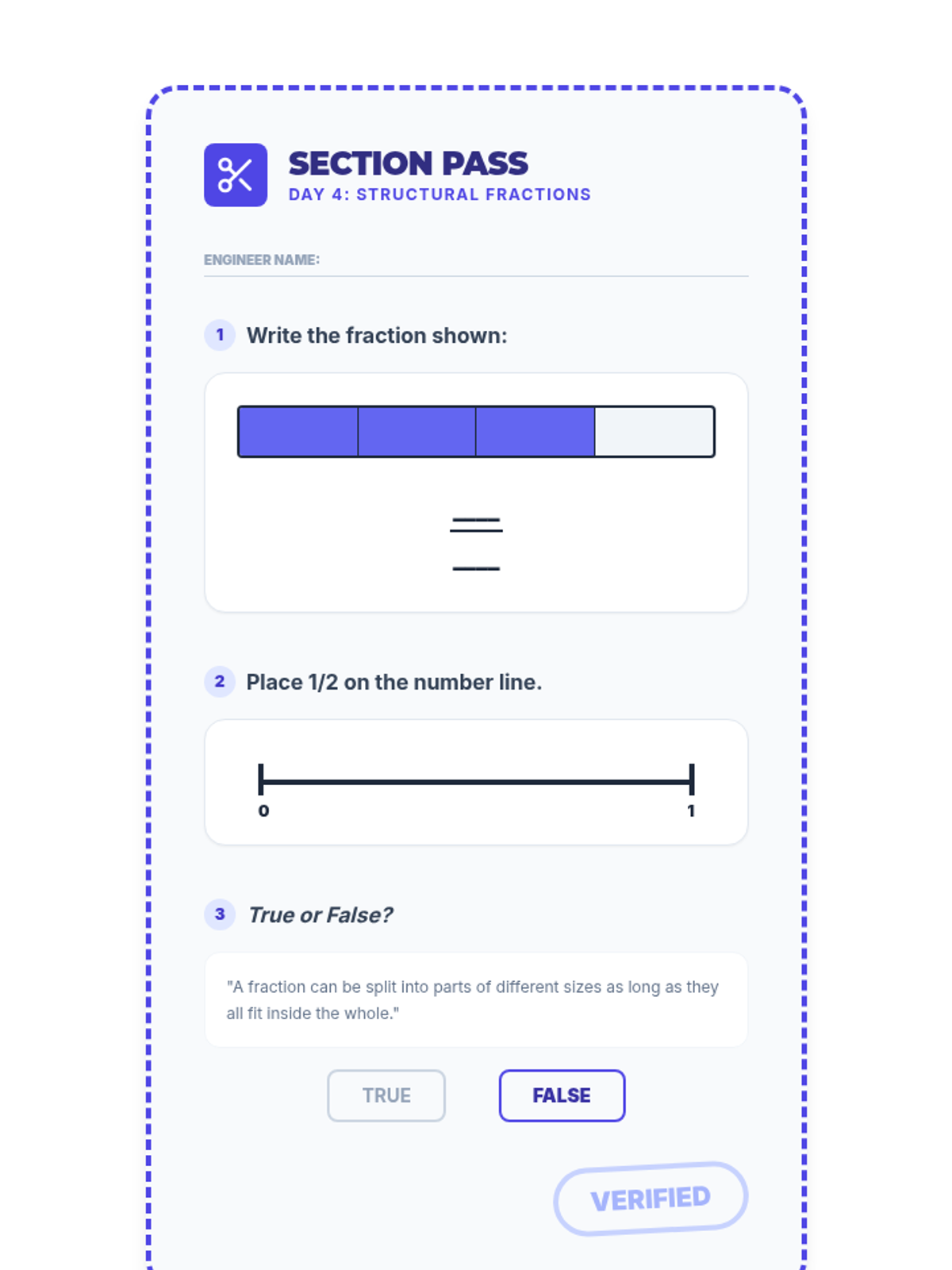 A short end-of-lesson assessment for Day 4 to check fraction identification and number line skills within an architectural theme.