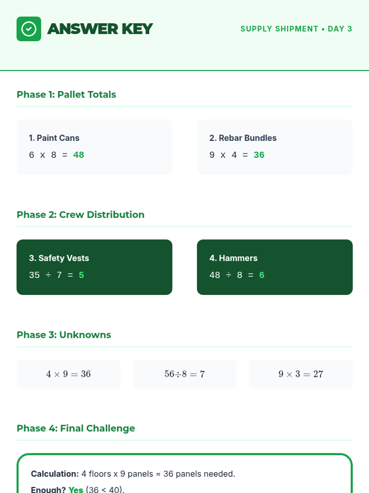 Answer key for the Day 3 Supply Shipment Worksheet.