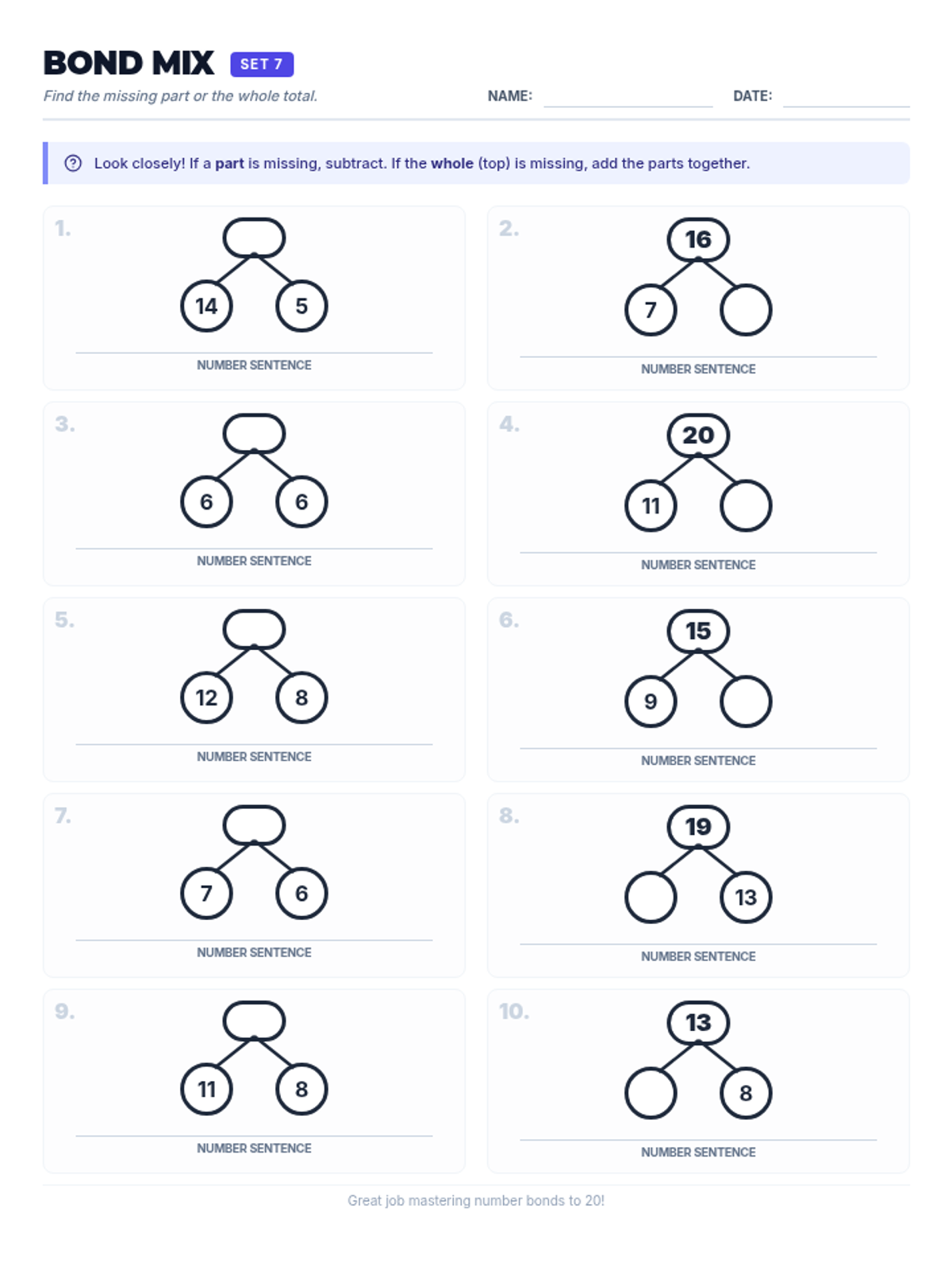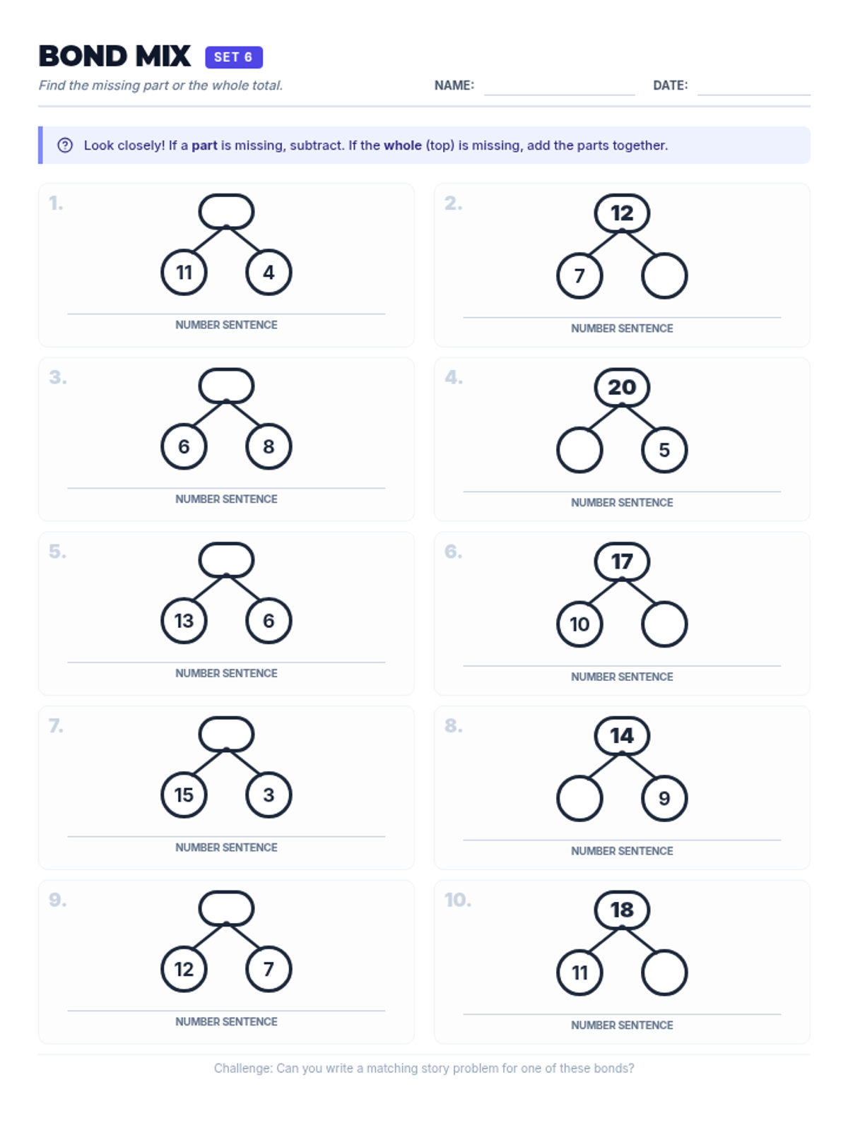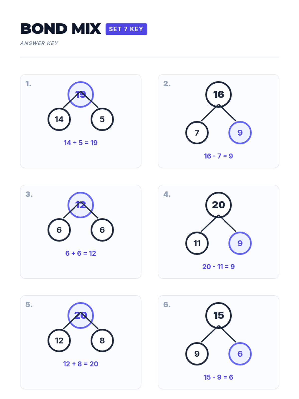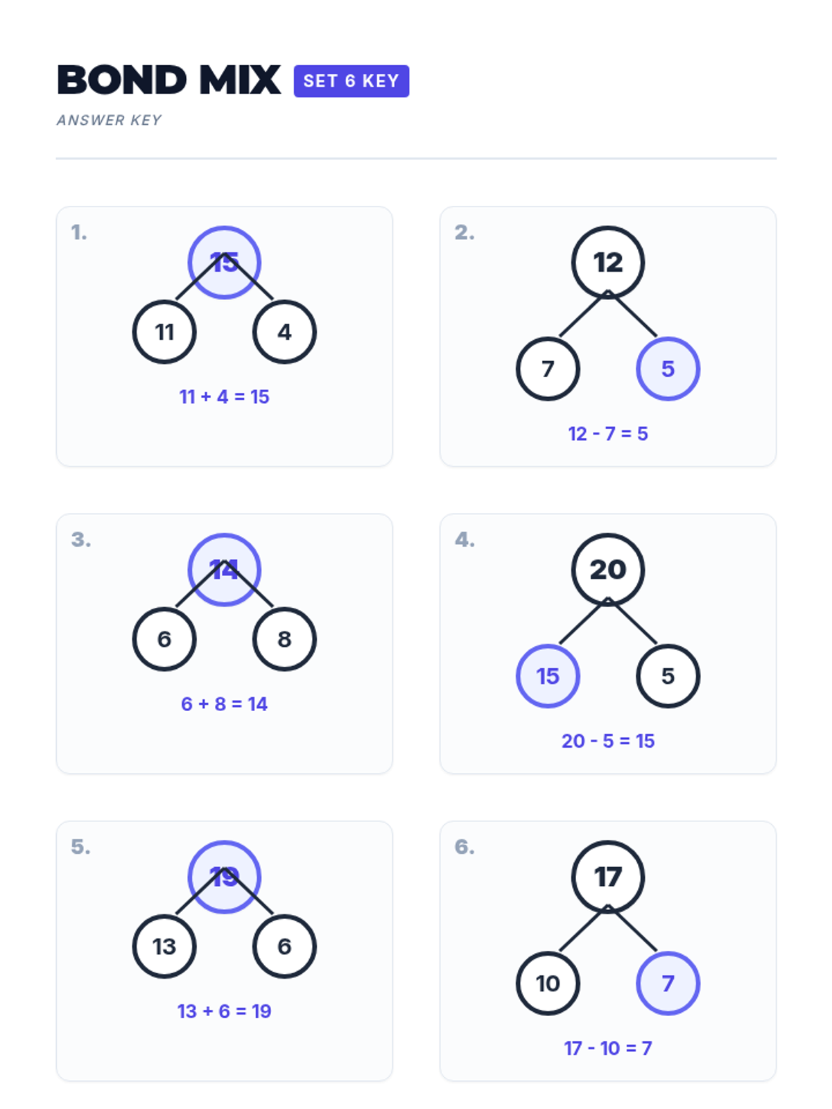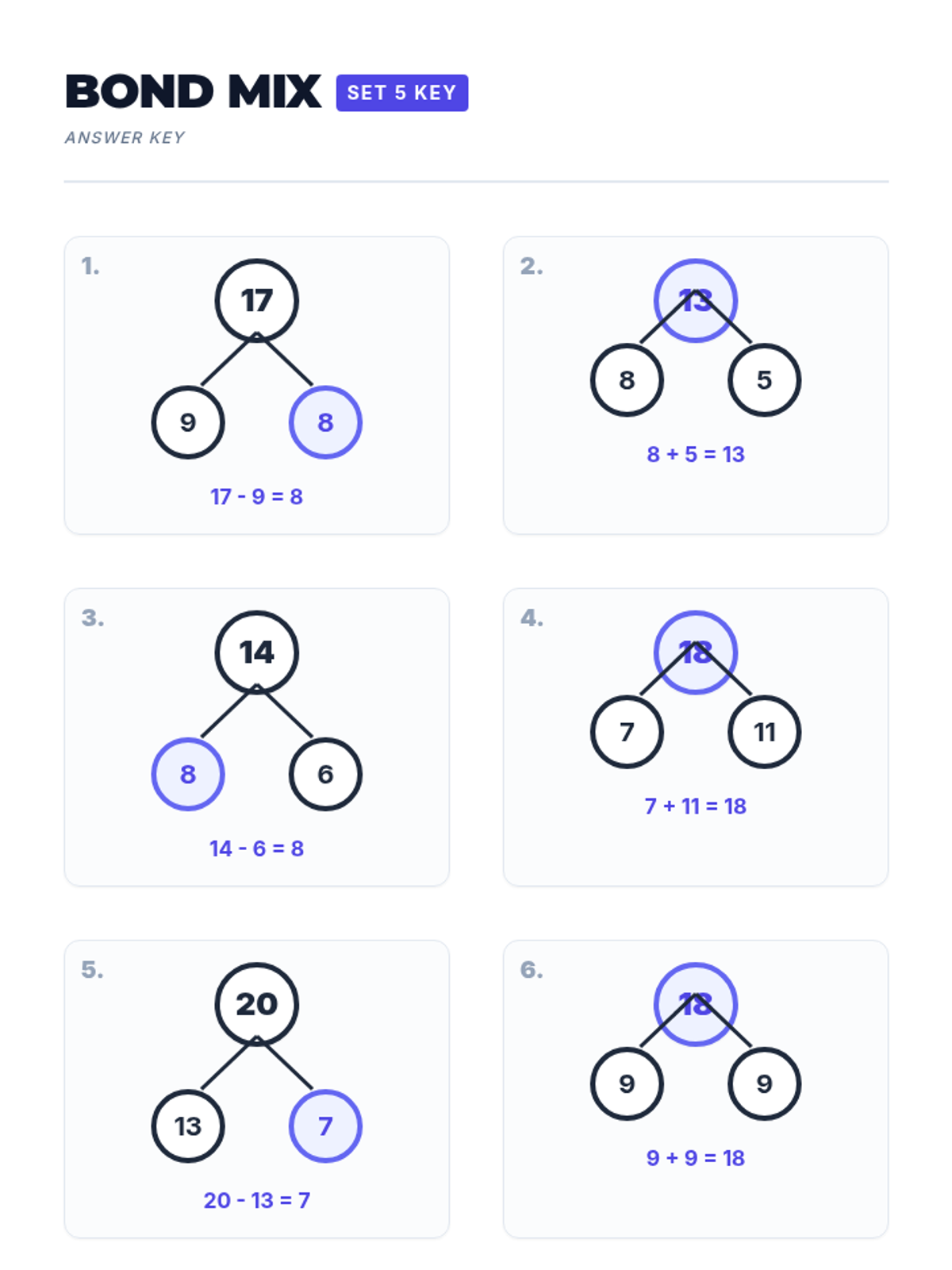Answer key for the Part Finder worksheet, clearly showing the missing addends and matching subtraction sentences.