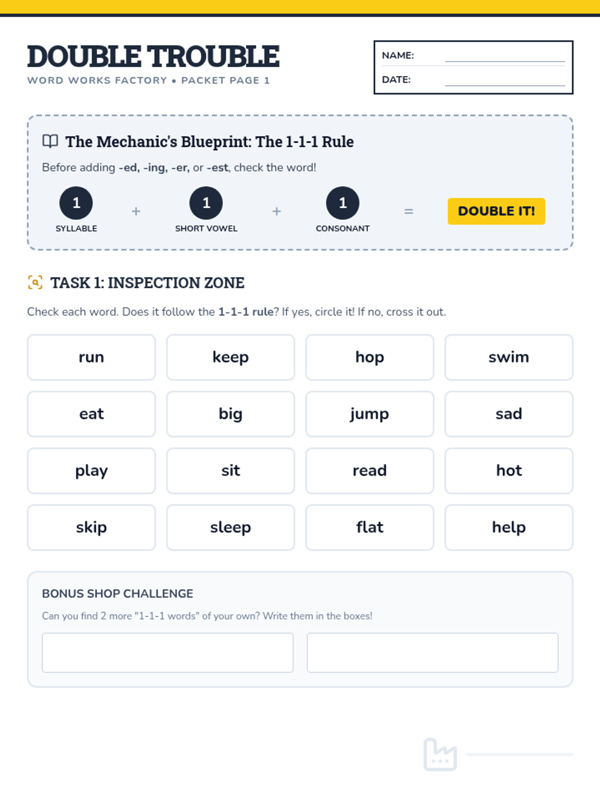 A 3-page independent practice packet for 2nd graders to master the 1-1-1 doubling rule. Includes word sorting, verb conjugation, and adjective comparisons within a 'Word Works' factory theme.