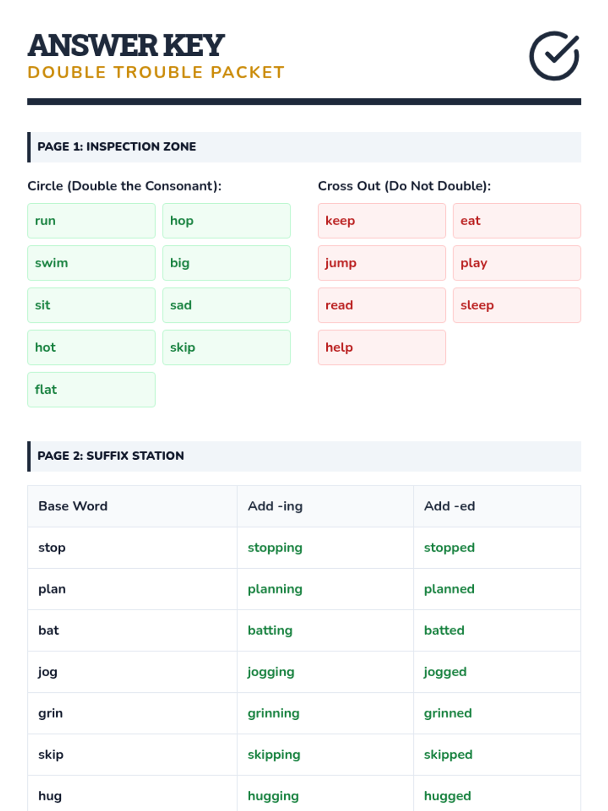An answer key for the Double Trouble Practice Packet, featuring corrected word sorts, suffix additions, and completed comparison sentences.