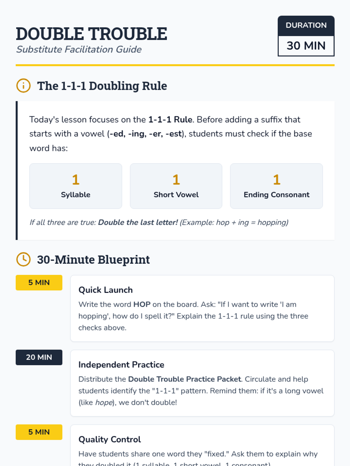 A facilitator guide for substitute teachers providing the 1-1-1 doubling rule explanation, a 30-minute lesson timeline, and common pitfalls to watch for.