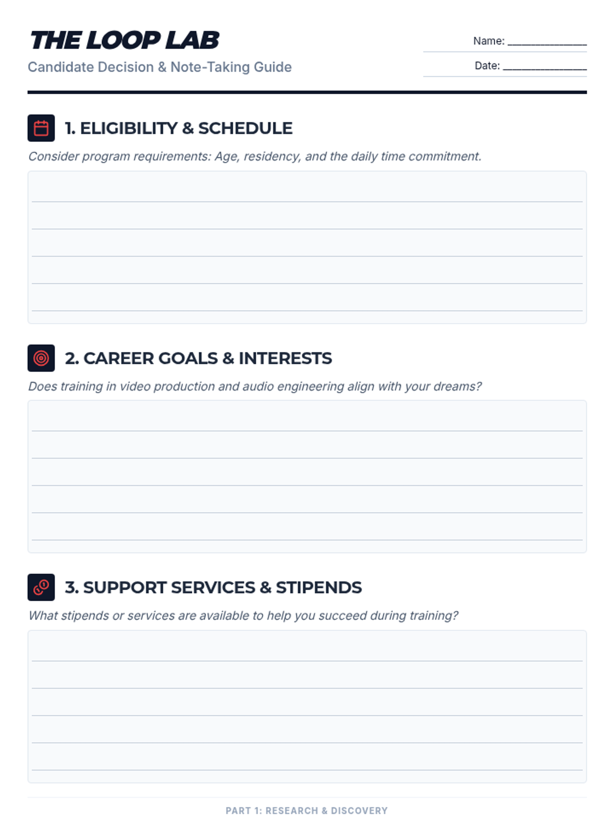 A comprehensive decision-making worksheet for students considering The Loop Lab, featuring note-taking sections for eligibility, career alignment, and support services, plus a T-chart and scaffolded reflection.